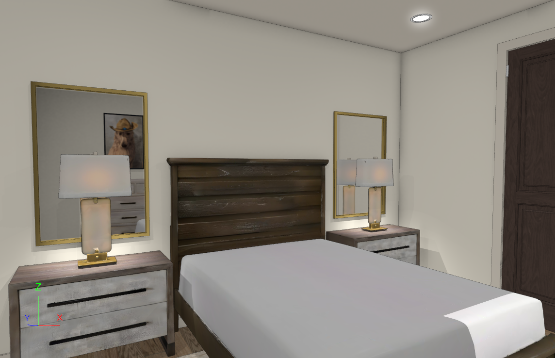 enhance this image to photorealistic 4k quality using hdri rendering do not alter composition proportions materials colors finishes lighting placement camera angle or architectural details do not add remove or modify any objects or features maintain exact design fidelity improve only realism through refined global illumination accurate material textures realistic shadow depth balanced exposure natural light behavior and high resolution surface detail the final result must look like a real photograph of the exact same scene add bedding to the bed and accessories to nightstands