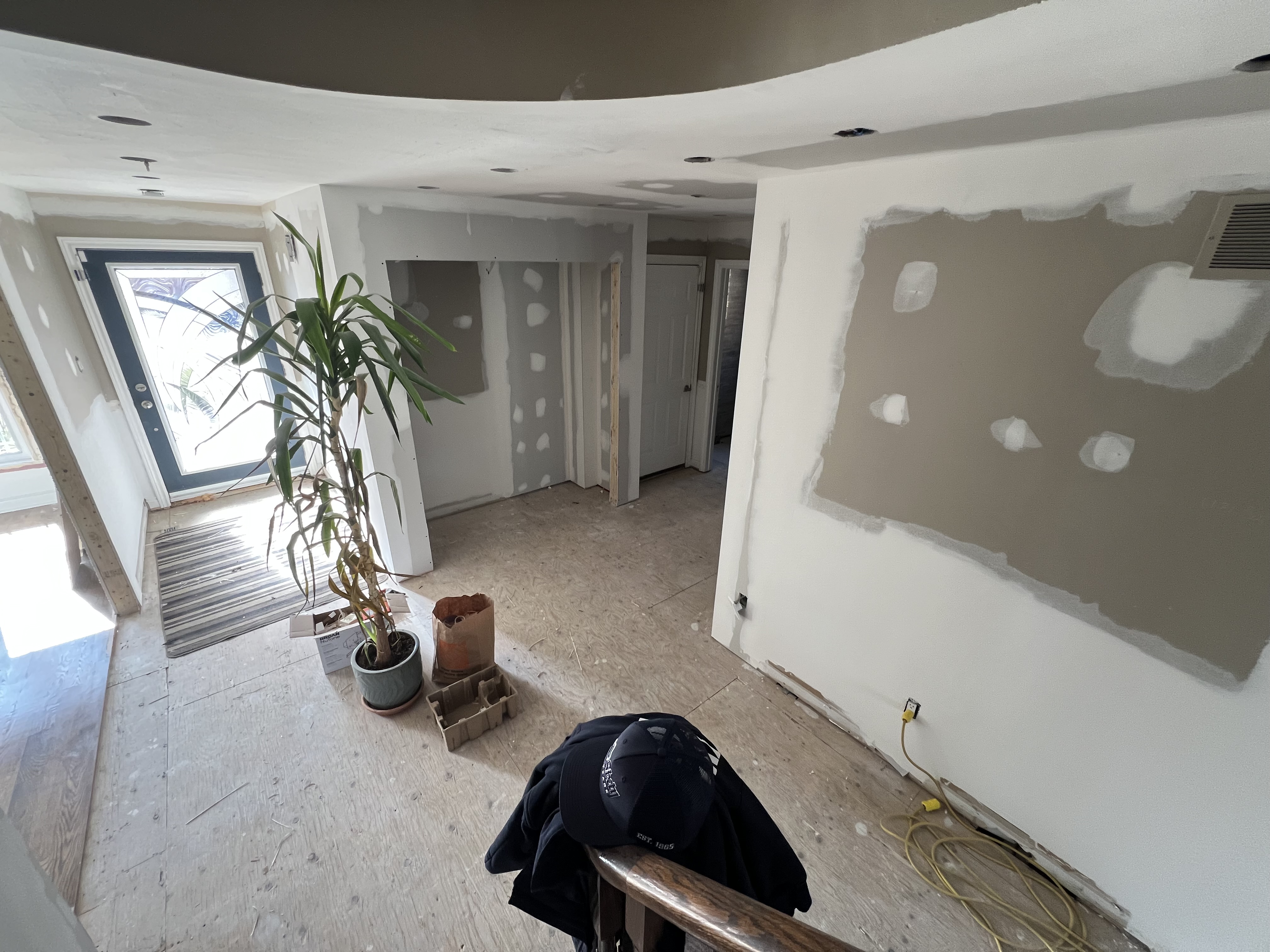 this is the entrance to my home design jt to look warm and inviting for 2026 floor will be mid colour hardwood do not change anything structurally lighting is as is add doors to closet and trim work include furnishing ideas remove junk from the floor no crown moulding or wall trim closet doors will have two three panel doors there will be large white subtle veining tiles in the vestibule create something that won t go out of style quickly