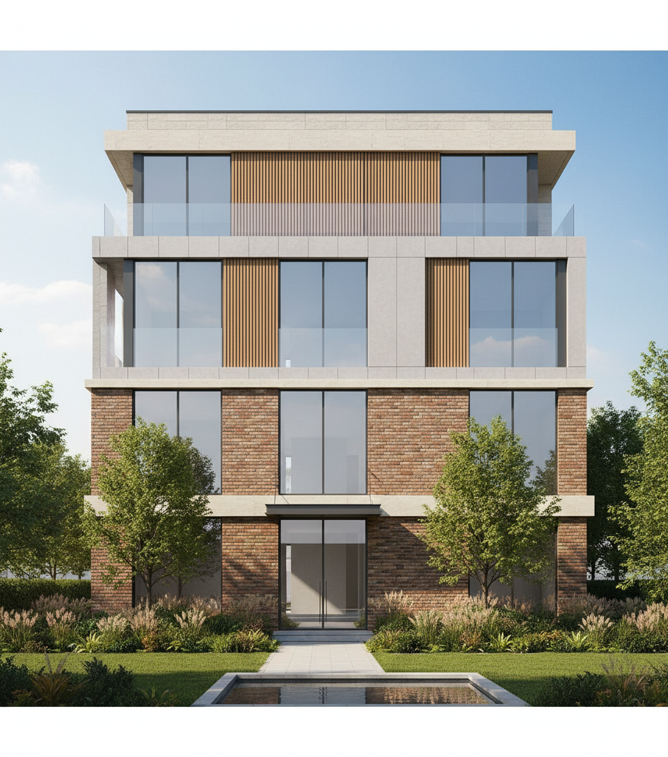 create ultra realistic images without changing any structure shape design or materials do not resize jpegs beige wood vinyl flooring plain off white walls beige wall panels add indirect light add halway view in the windows white frame window