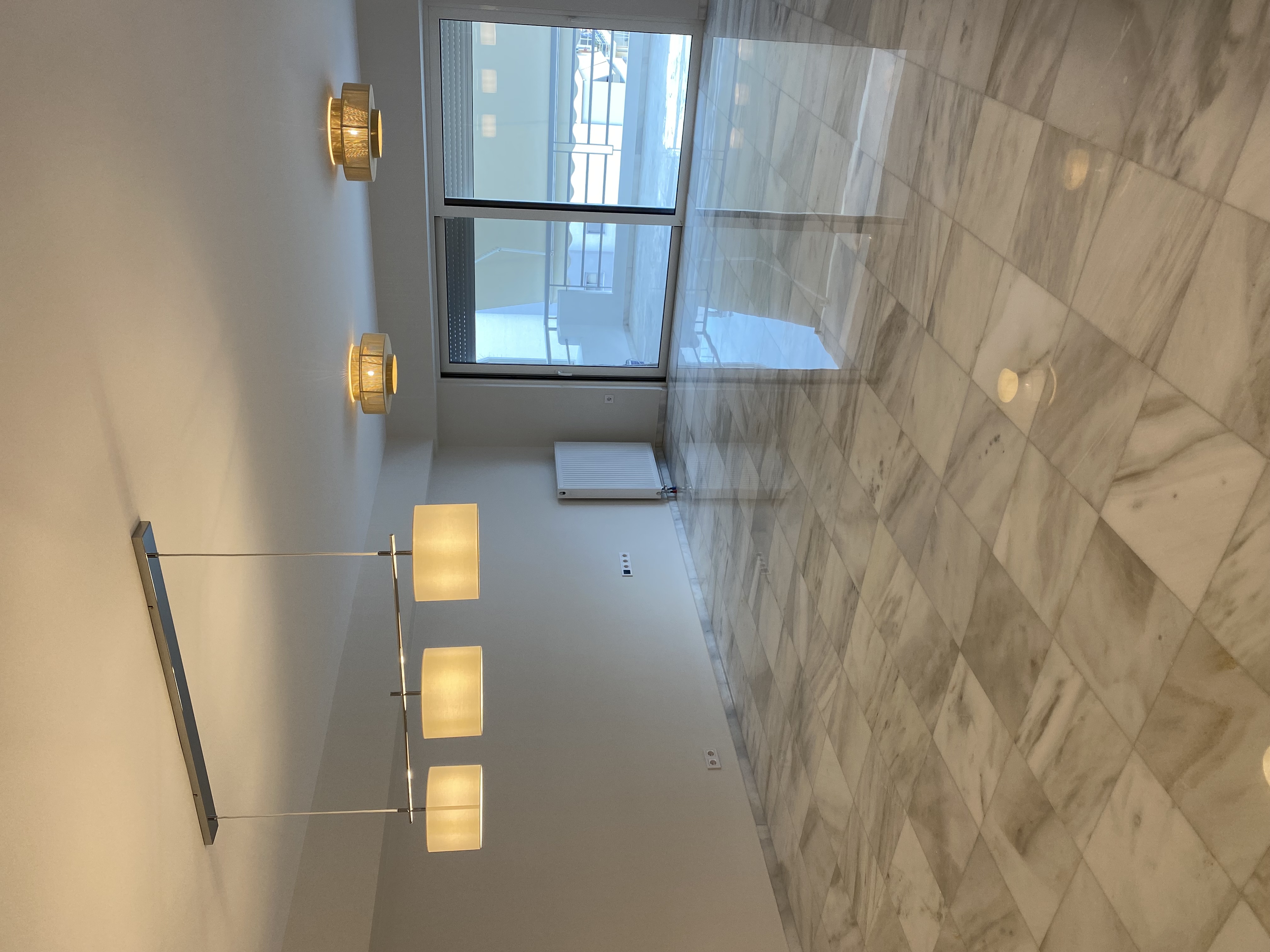 enhance this image in a professional real estate photography style while strictly preserving the original lighting fixtures and scene do not modify or reinterpret any light sources keep the exact lighting direction intensity and color temperature as in the original image improve overall image quality by increasing sharpness clarity and resolution remove pixelation and compression artifacts while maintaining natural textures apply subtle noise reduction and detail enhancement without creating an artificial or overprocessed look correct lens distortion and straighten vertical lines balance exposure gently without flattening contrast keep materials realistic avoid overly smooth or cgi like surfaces the floor must remain exactly the same material and pattern existing marble do not change replace or reinterpret the flooring in any way only enhance its appearance by improving clarity contrast and reflections so it looks more refined clean and high end while fully preserving its natural texture veining and layout do not change colors objects layout or lighting setup in any way only enhance the existing photograph