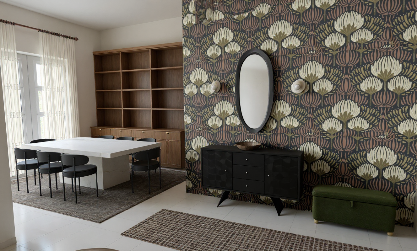 a modern kitchen and living room with bright daylight in front of the window there are curtains