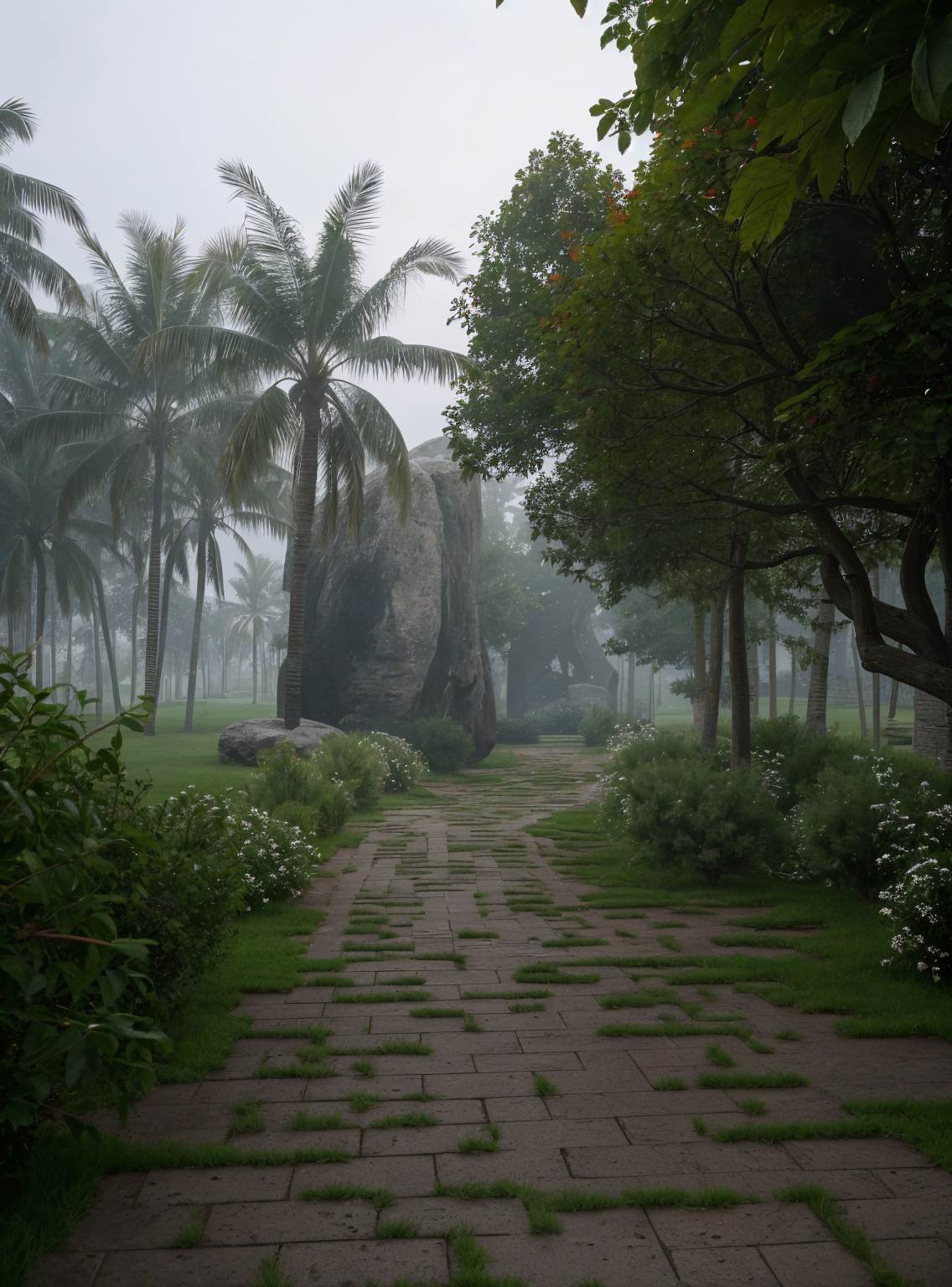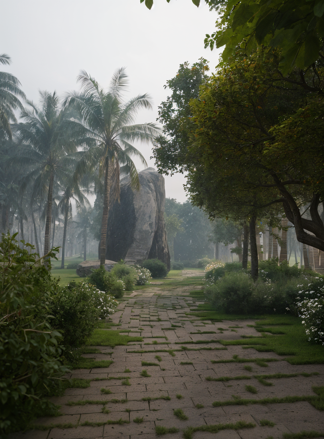 enhance the existing render to be more realistic and detailed while keeping the composition and all elements exactly the same refine materials lighting and textures for natural realism improve vegetation surfaces and shadows without altering the design or layout add soft fog and an early morning ambience with gentle warm light where sunlight softly highlights the terraces and edges creating depth with natural contrast