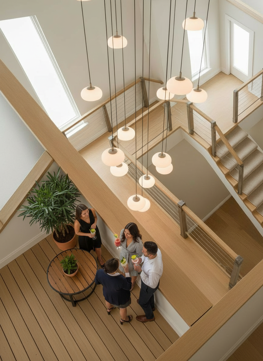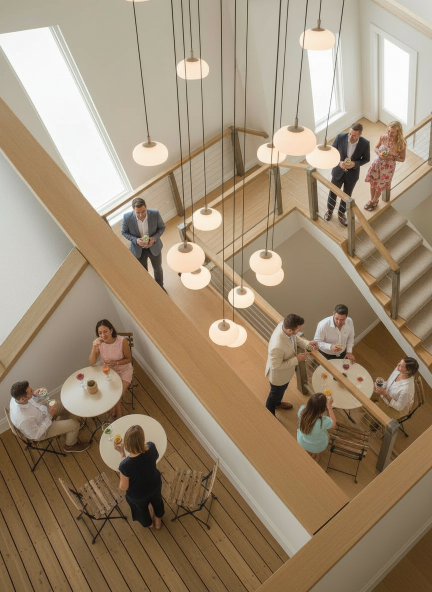 replace floor on left with decking add men and women having cocktails with a plant add some men and women scattered standing around having cocktails remove table and chairs remove decking to the right