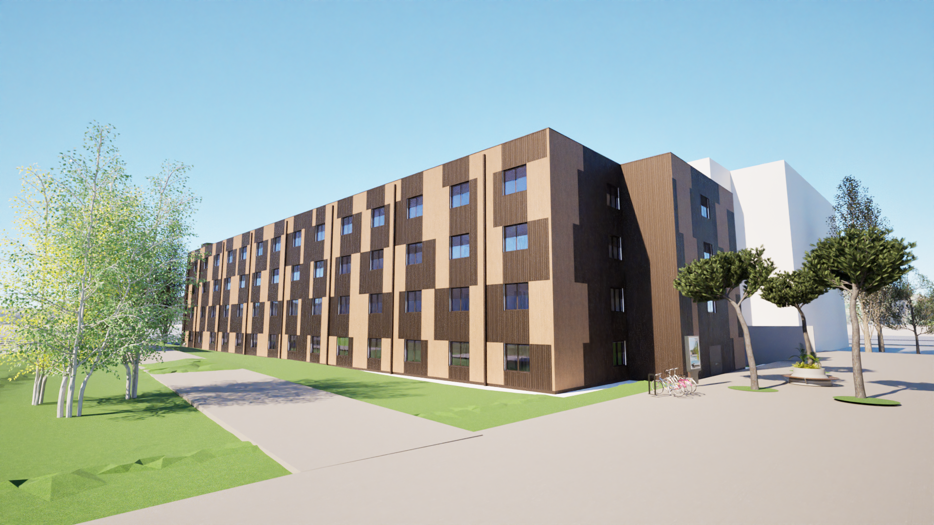 render a modern building with a striking geometric facade featuring alternating mettalic dark borwn metallic panel and wood panels the building is bathed in soft golden sunlight highlighting its contemporary design surround it with lush green grass and tall slender trees with bright green leaves creating a serene and inviting atmosphere the sky is a clear brilliant blue adding a touch of vibrancy to the scene include a few elegant round crowned trees in the foreground on the right along with a bicycle and modern bench for a touch of urban life while maintaining a calm and peaceful ambiance
