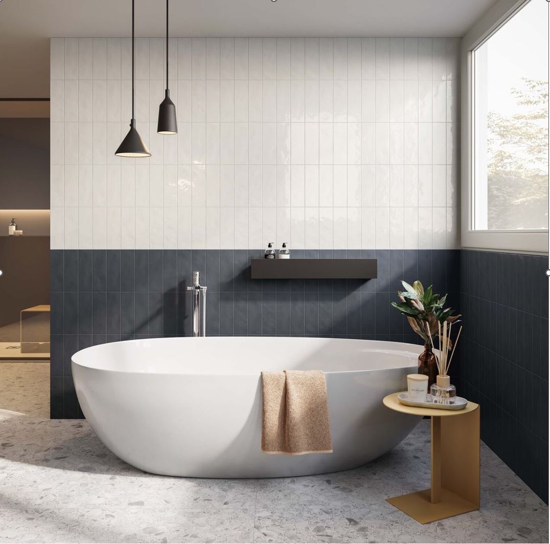 interior shot a modern bathroom with a freestanding bathtub white and blue tiles on the walls