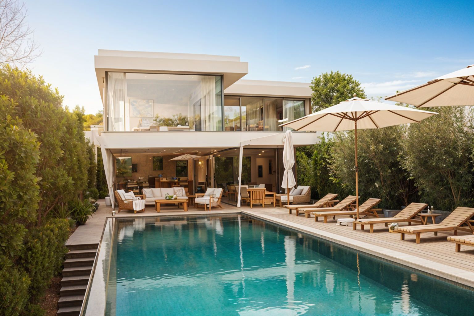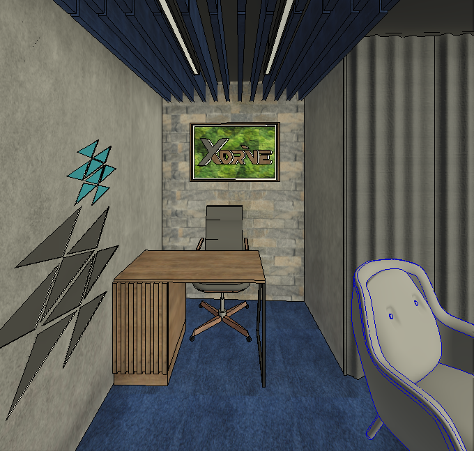 do not change the geometry create a modern office interior with a cozy atmosphere the flooring is a luxurious deep blue carpet the wall behind the desk is from natural stone and there is a framed scandinavian moss and a logo above a wooden desk with a rich walnut finish do not change the logo letters the ceiling features eye catching dark blue beams and dark gray paint the armchair should be of brown leather material the curtains are from very dark grey textile on the whole left wall there is an acustic panel with an art piece and the triangle forms are cut inward the panel use ambient lighting for a warm inviting feel complemented by a modern black and white linear ceiling light fixtures
