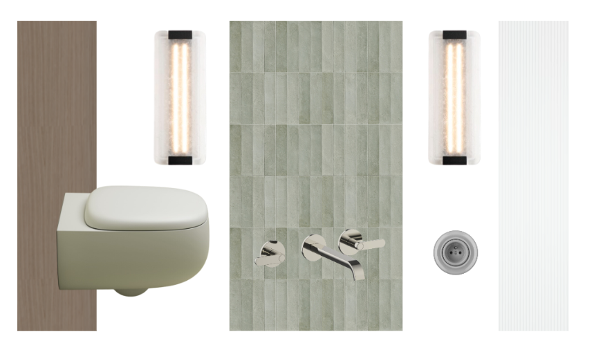 interior shot matt green tiles mirror in the middle travertin counter white toilette mickel armature