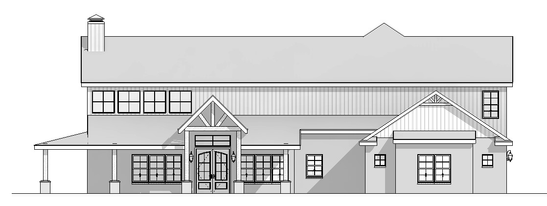 create a picturesque rendering of a charming two story gabled house with a blend of rustic and modern aesthetics the walls are painted a soft sandstone beige and the roof is a dark slate gray reflecting a modern yet cozy look the front porch and supporting columns are adorned with warm chestnut brown wood enhancing the inviting feel the window frames are crisp white allowing them to pop against the facade the front door is painted a rich mahogany brown flanked by classic black sconces surrounding the scene is a lush garden with vibrant green bushes and colorful flowers in shades of lavender and yellow the sky above is a clear bright blue evoking a peaceful and serene atmosphere