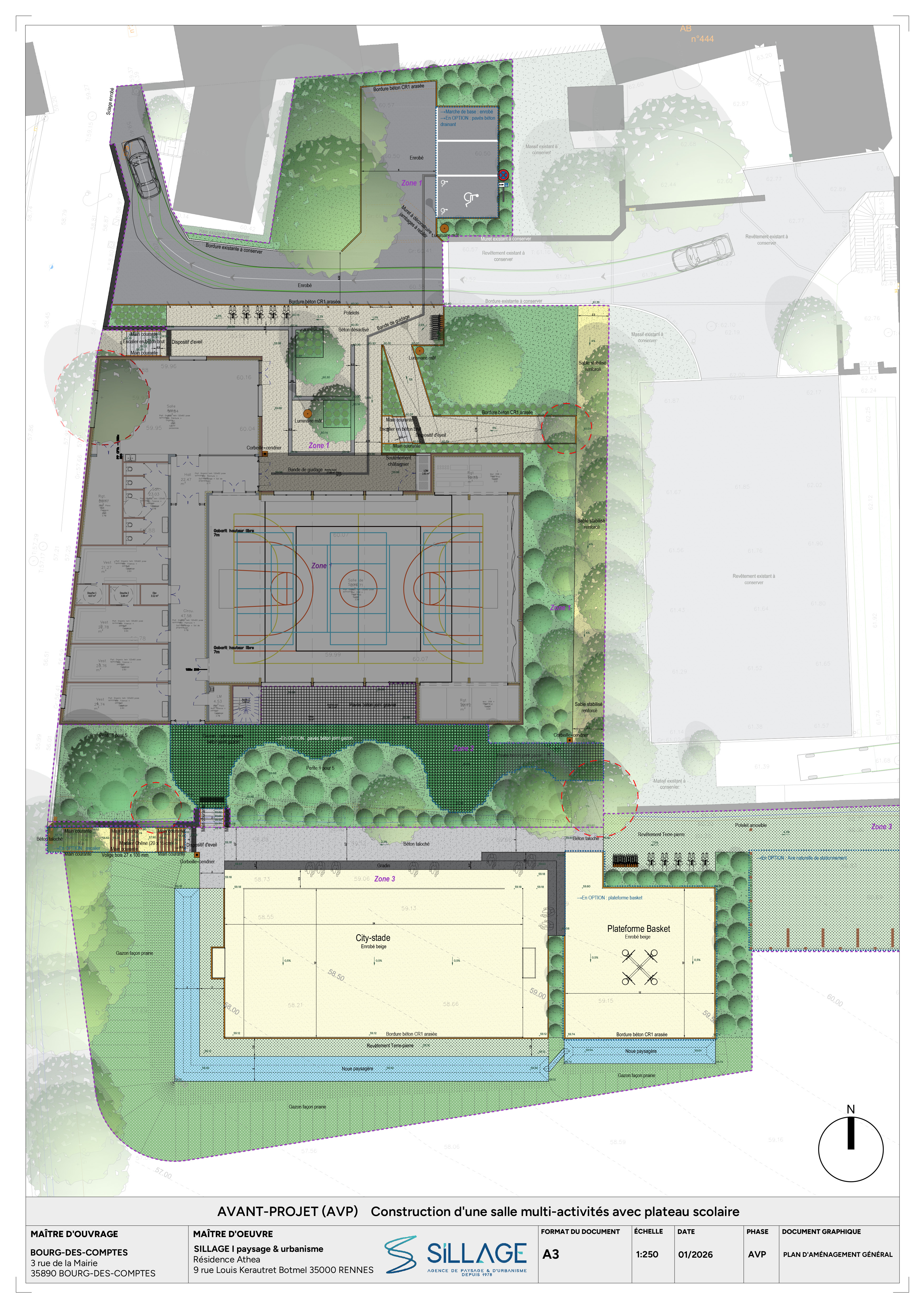 sur ce plan tr s plat peut tu me faire un joli plan en respectant le projet avec de belles ombres et texture le nord est vers le haut donc le soleil vient du sud les ombres sont vers le haut ne rien faire sur le projet architectural au centre du projet en gris clair c est une salle de sport moi je m occupe de l exterieur pour l am nagement paysager en bleu en bas c est une noue paysag re donc aspect engaonn avec l ger creux pour les eaux pluviales au sud de la salle de sport il y a des petits carr s vert formant une forme arrondi il s agit de pav s b ton joint gazon il y a des textes not s sur le plan tu peux les lire et mettre le bon revetement