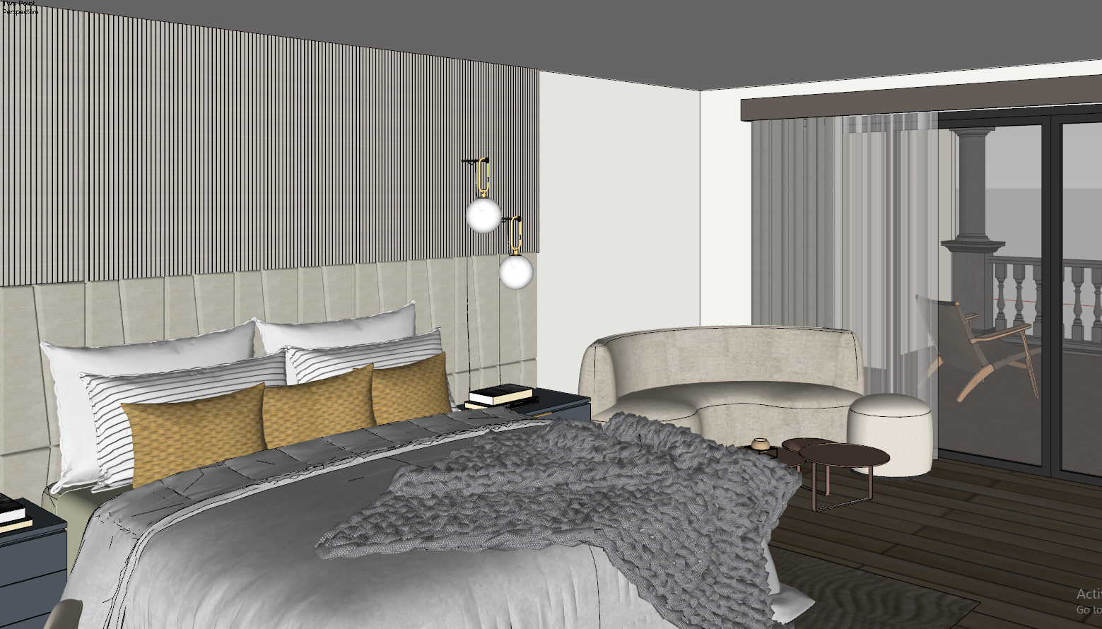render this scene ultra realistic use high definition textures add lights to the ceiling make it morning time add warm led mood light inside curtain rod hanger
