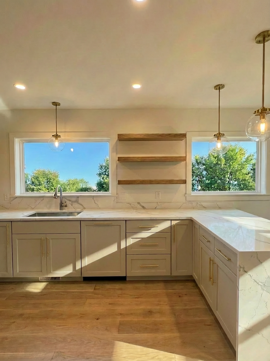do not change the structure layout or window placement of this kitchen replace wood floor with a light pine wide plank wood floor
