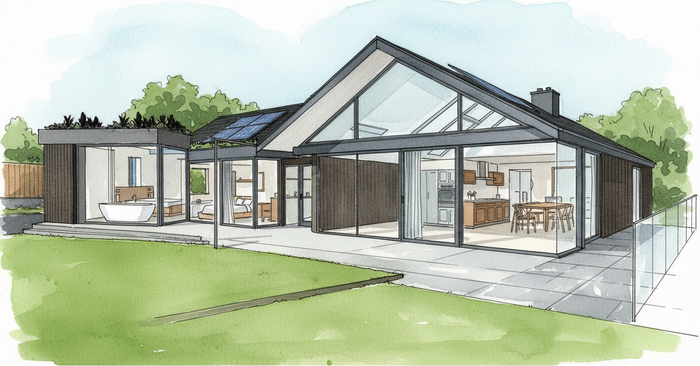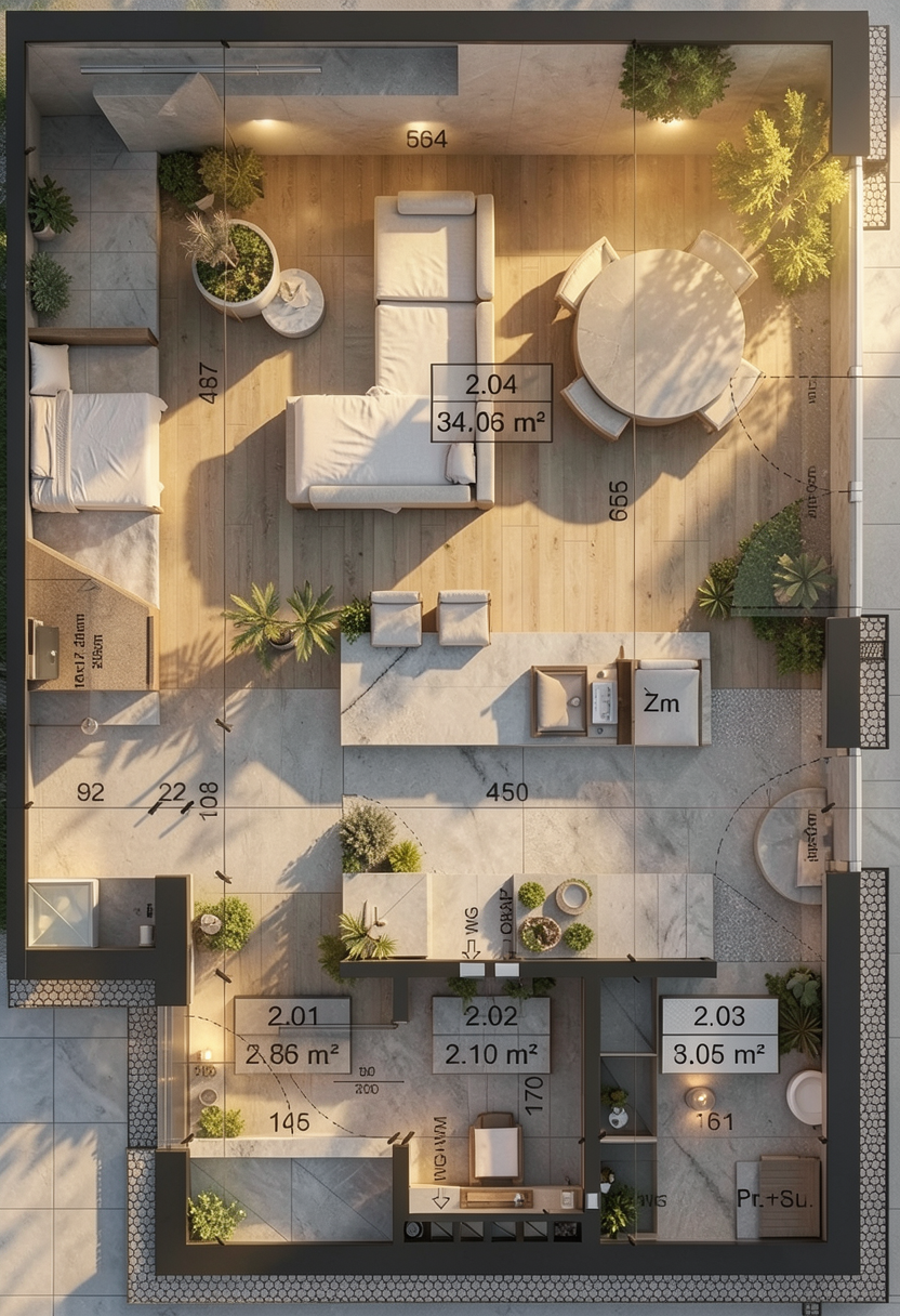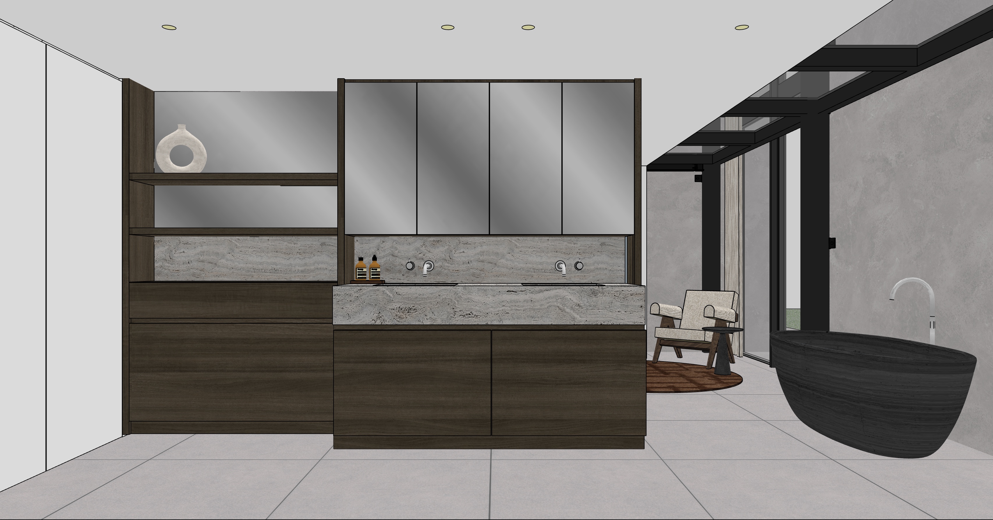 create a high end architectural interior realistic render calm and refined atmosphere soft natural daylight neutral warm palette balanced tones no orange cast diffused light with soft shadows subtle contrast natural color accuracy emphasis on materiality and texture tactile surfaces minimal styling clean architectural lines integrated design serene and timeless space depth and layering cinematic softness slightly desaturated tones photorealistic 35mm lens soft color grading quiet luxury emotional balance breathing space no harsh lighting no strong color cast no oversaturation maintain 100 of the geometry materials colours and layout with a sharp photorealistic result add more natural daylight most important materials concrete stucco warm grey ceramic tiles 90 x 90 cm fumed mirror glass open pore travertine titanium carpentry matt white
