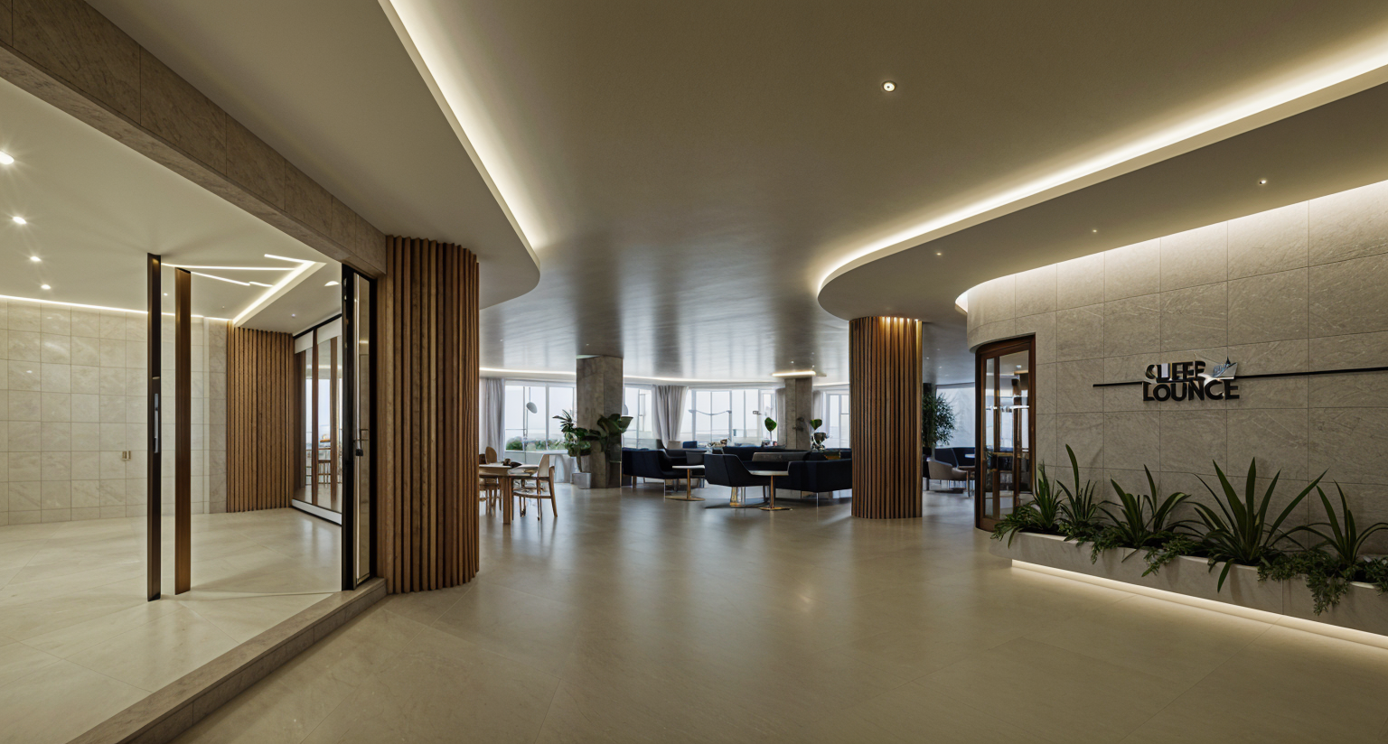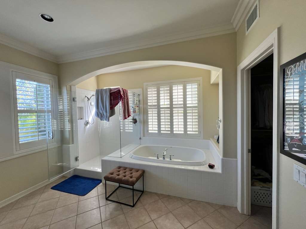 free floating bathtub blue tile in shower and around bath tub and large calacatta tile on the floor architecture