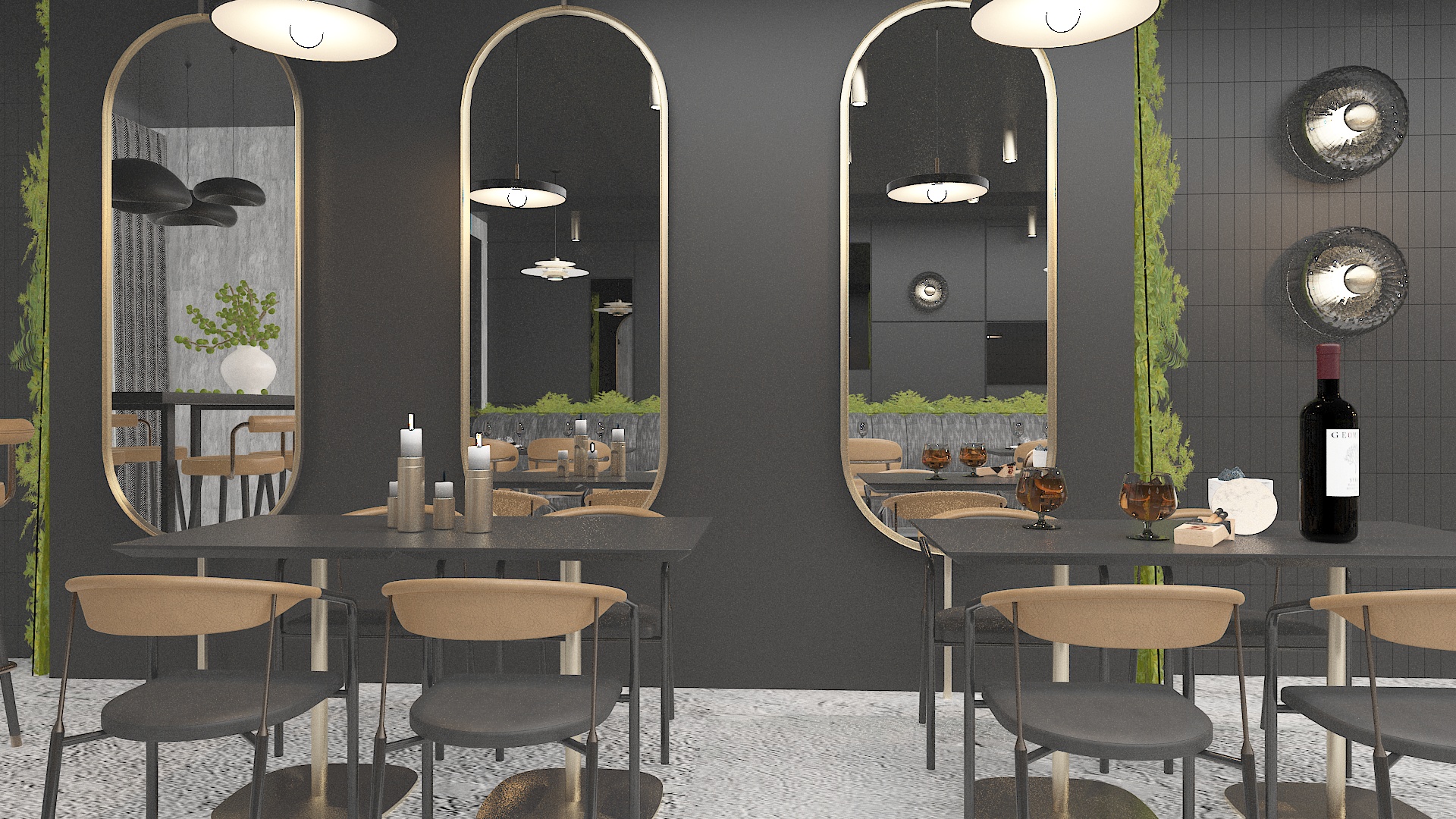 put hyper realistic black stone tiles on the wall between two green vertical and behind wall lamps this stone tiles would be smaller than 5x30cm and put vertical