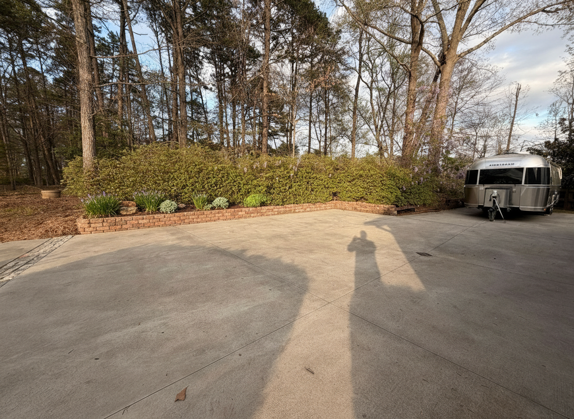 i want to replace these rotting wood small retaining wallls with brick or similar material can you create a rendering with new material keep the photo as is only update new wall i want the plants to be very easy maintenance with no irrigation requiered as i cannot irrigate keep existing vegetation continue wall along the airstream where the wood wall continues use brick