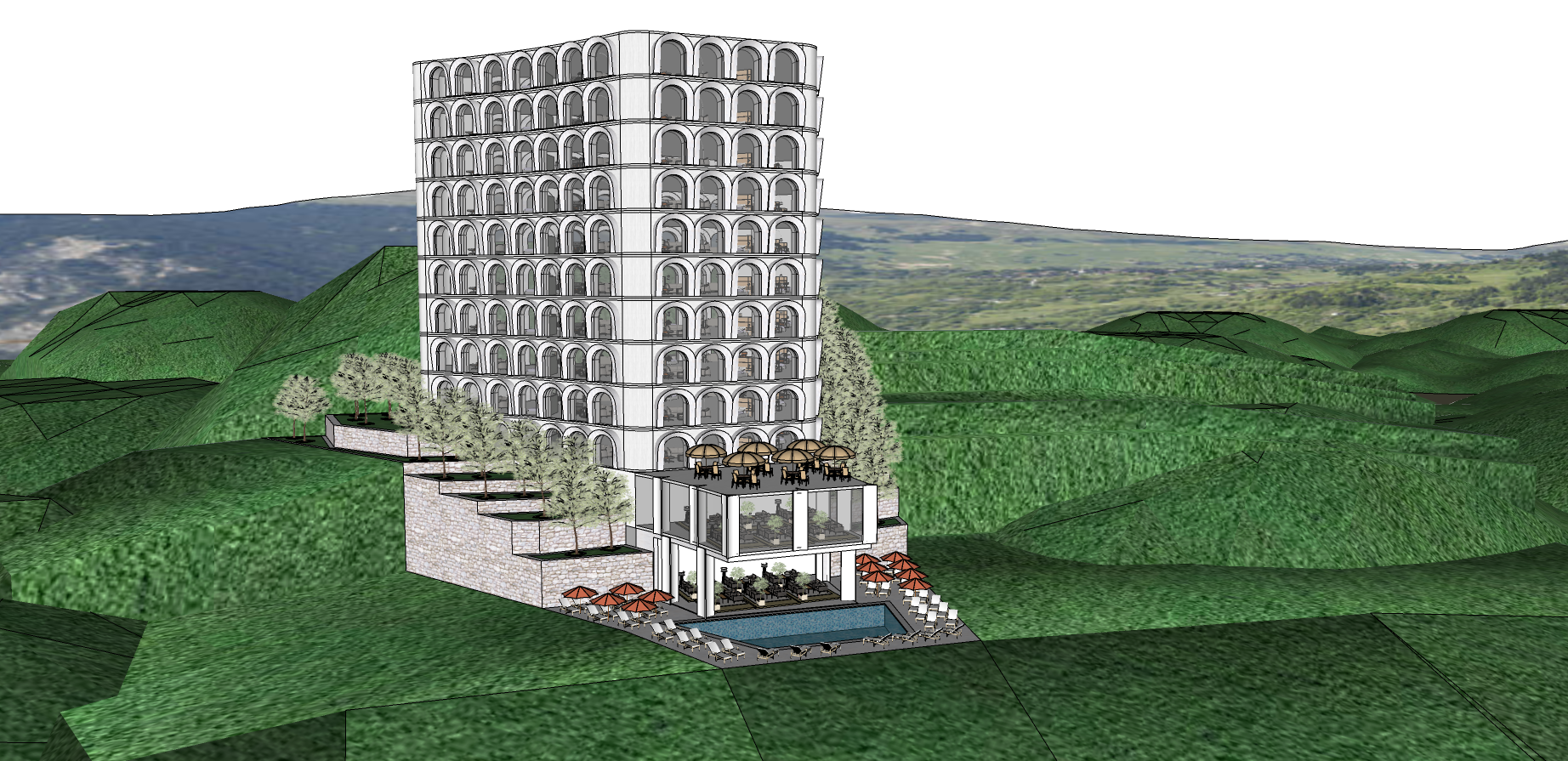 create a digital rendering of a tall elegant building with classical architectural features the structure has multiple arches and is set against a backdrop of lush rolling hills use a crisp white for the building s fa ade accentuated by subtle gray shadows to highlight the depth of the arches surrounding the building incorporate rich green hues for the hills creating a vibrant natural landscape add a serene blue for the swimming pool with sun loungers in soft beige the terrace features dining tables with dark brown finishes and warm colored parasols set the scene under a clear bright sky to evoke a tranquil and inviting atmosphere it is located on hills and the area has elite medium tall residential buildings