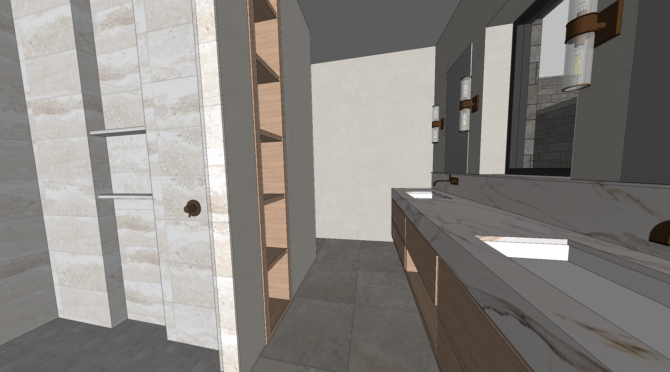 make bathroom look realistic make floor tile lighter add trees behind window dont add window at the back wall add wall art instead eliminate toilet dont add green reflection to walls add glass shower door