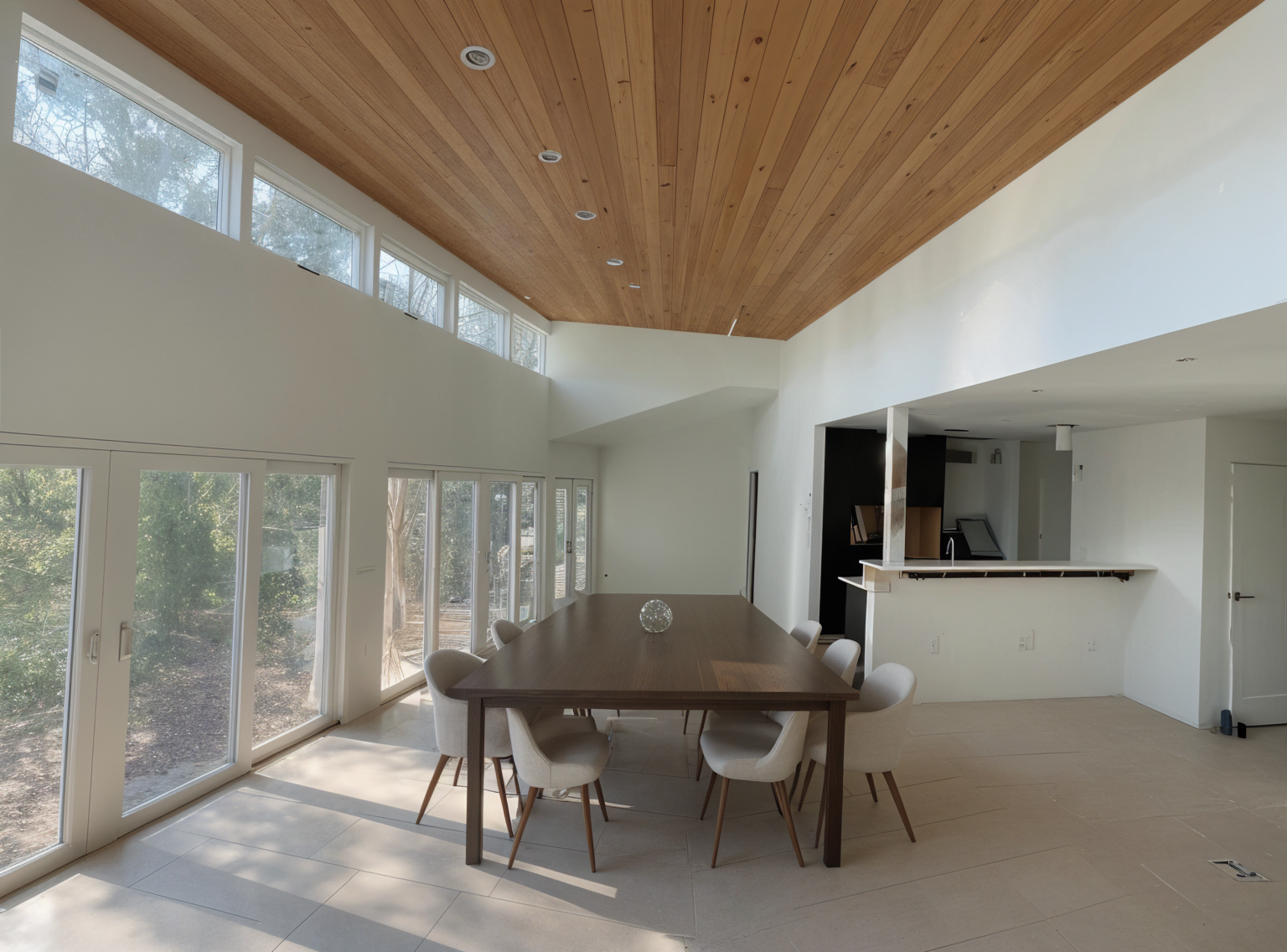 a two story house in plain yellow color without texture with windows in matt black and a red roof on a sunny day