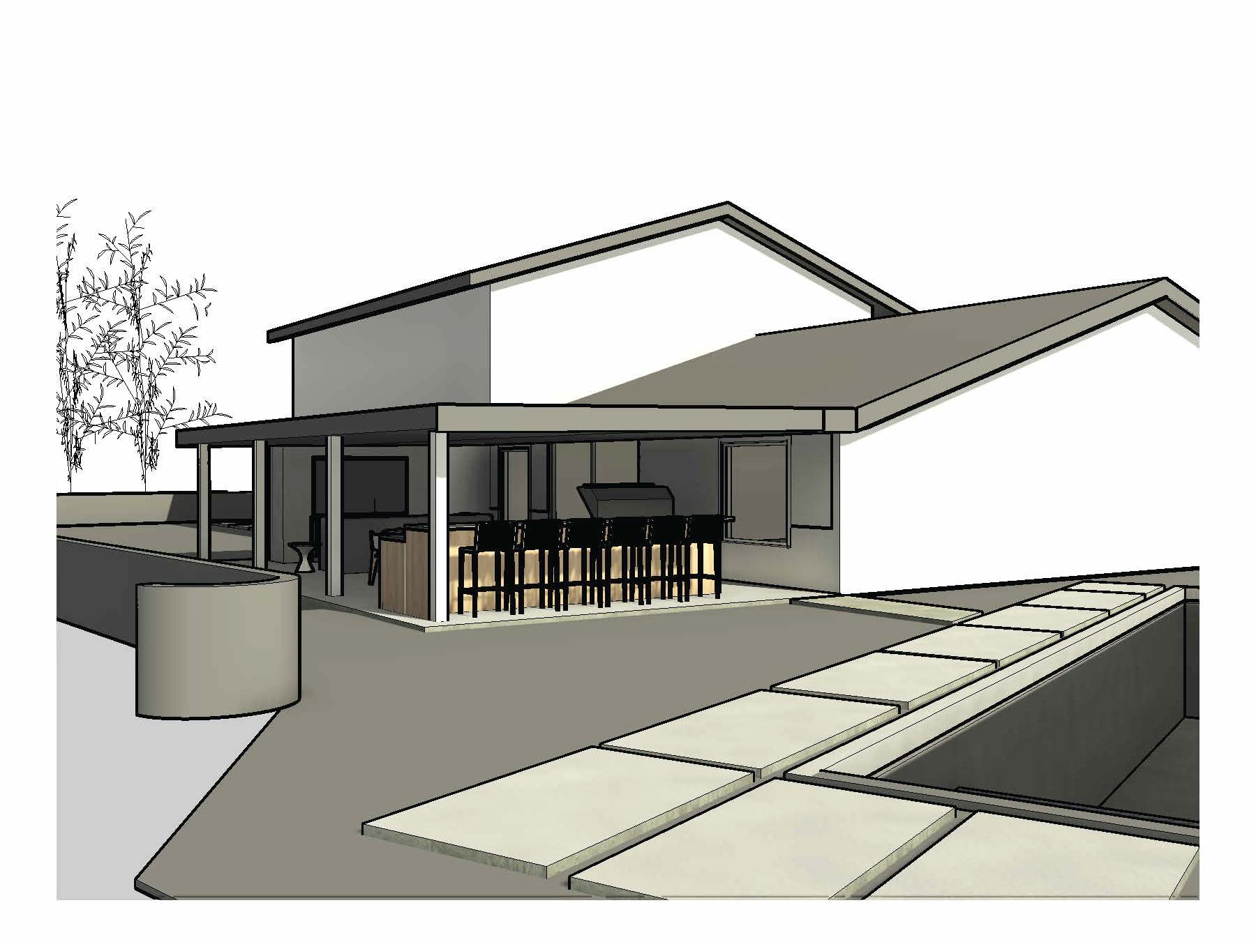 exterior shot preserve the exact geometry and layout of the 3d model maintain the same camera angle and perspective do not move replace or reposition any modeled elements including cabinetry countertops furniture fixtures walls or openings all objects must remain in their original location update materials and finishes only using the reference image for inspiration apply a warm california modern palette white plaster walls polished concrete flooring light oak cabinetry and furniture natural stone countertops linen upholstery and soft neutral tones enhance lighting and realism while retaining the exact furniture layout and architectural model