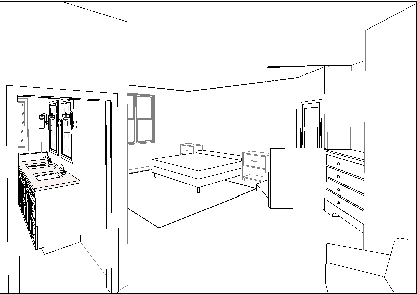 render this plan perspective with carpet floors and light bright finished aesthetic the bed should be a modern 4 poster king sized bed