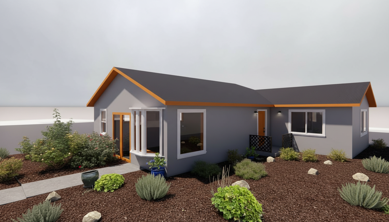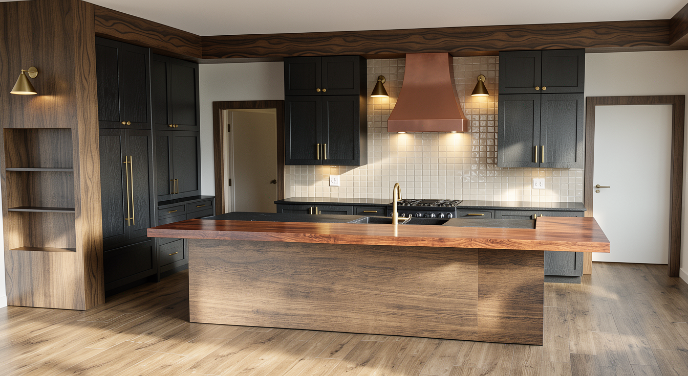 photorealistic interior kitchen render maintain exact layout proportions and colors from the model do not redesign make realistic shadows nothing too bright but just natural cabinetry dark charcoal shaker cabinets with wood graining showing through along with warm brass hardware island warm medium walnut wood with a darker stained wood countertop upper beam shelving wall natural walnut wood with visible grain countertops matte black stone countertop on base cabinets and island backsplash replace full slab backsplash with 12 x 3 brick inspired tile variation uneven edges subtle color variation range hood brushed aged copper metal hood soft patina not shiny warm tone faucet hardware brushed brass finish doorway this is a pocket door opening no swing door visible range wall sconces warm brass sconces with soft warm light lighting warm natural daylight soft interior lighting realistic shadows style high end custom kitchen realistic materials pbr textures soft reflections keep cabinet colors wood tones and layout exactly as modeled make render look like real life but not change design