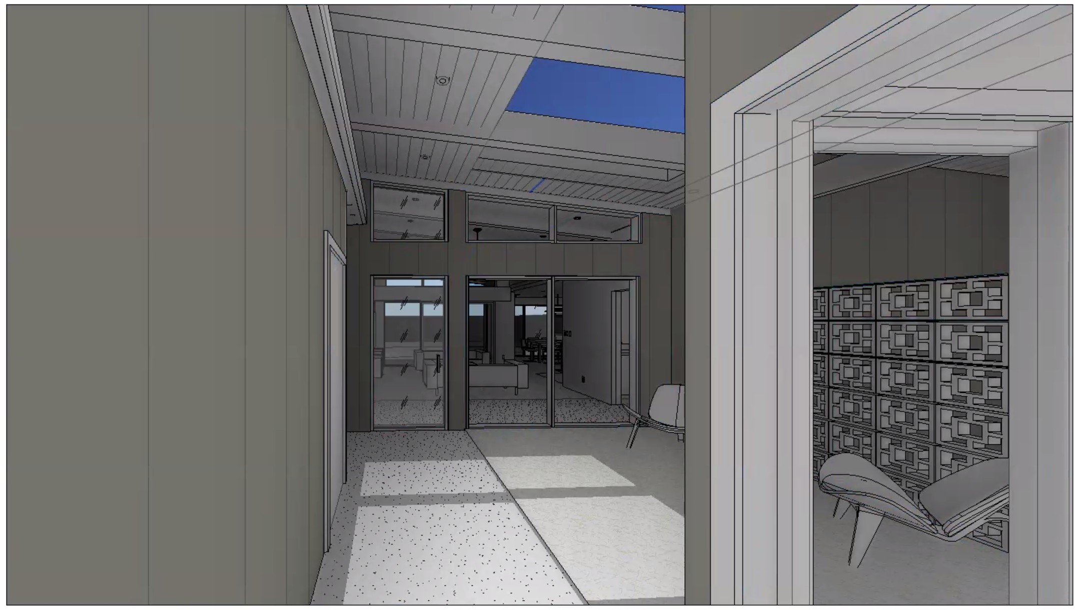a relaxing japandi inspired modern interior entry courtyard view of a mid century eichler designed suburban home with t g ceilings set in arizona with a painted breezeblock wall the main living area of the house is visible behind large windows in the mid range background with the backyard visible in the far background