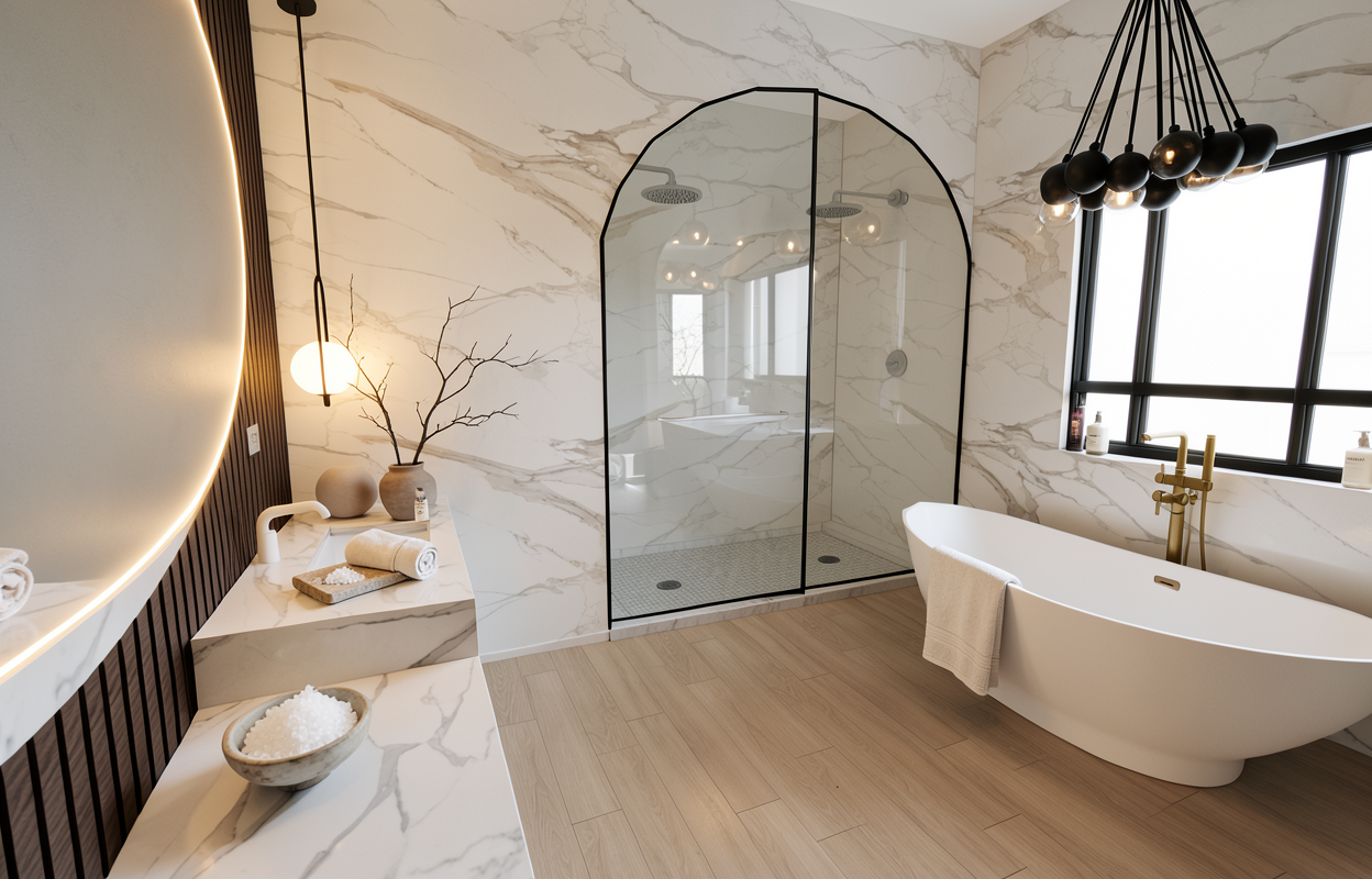 realistic architectural interior render of a modern minimalist space of a house keep the exact original layout proportions furniture placement materials and camera angle no redesign no added or removed elements clean contemporary aesthetic with soft neutral color palette realistic shadows warm indirect ceiling lighting subtle glow balanced exposure real life material textures physically accurate materials pbr textures correct reflections subtle glossiness variation soft ambient occlusion global illumination ray traced lighting realistic camera lens 35mm eye level perspective correct scale and depth clean styling minimal clutter photorealistic interior photography high dynamic range sharp details natural color grading architectural digest style compact modern minimalist bedroom with light wood wardrobe on the left side upholstered grey bed with soft fabric headboard white bedding with layered pillows including a rust accent bolster dark grey throw blanket small bedside table on the right white tiled floor and plain light colored walls