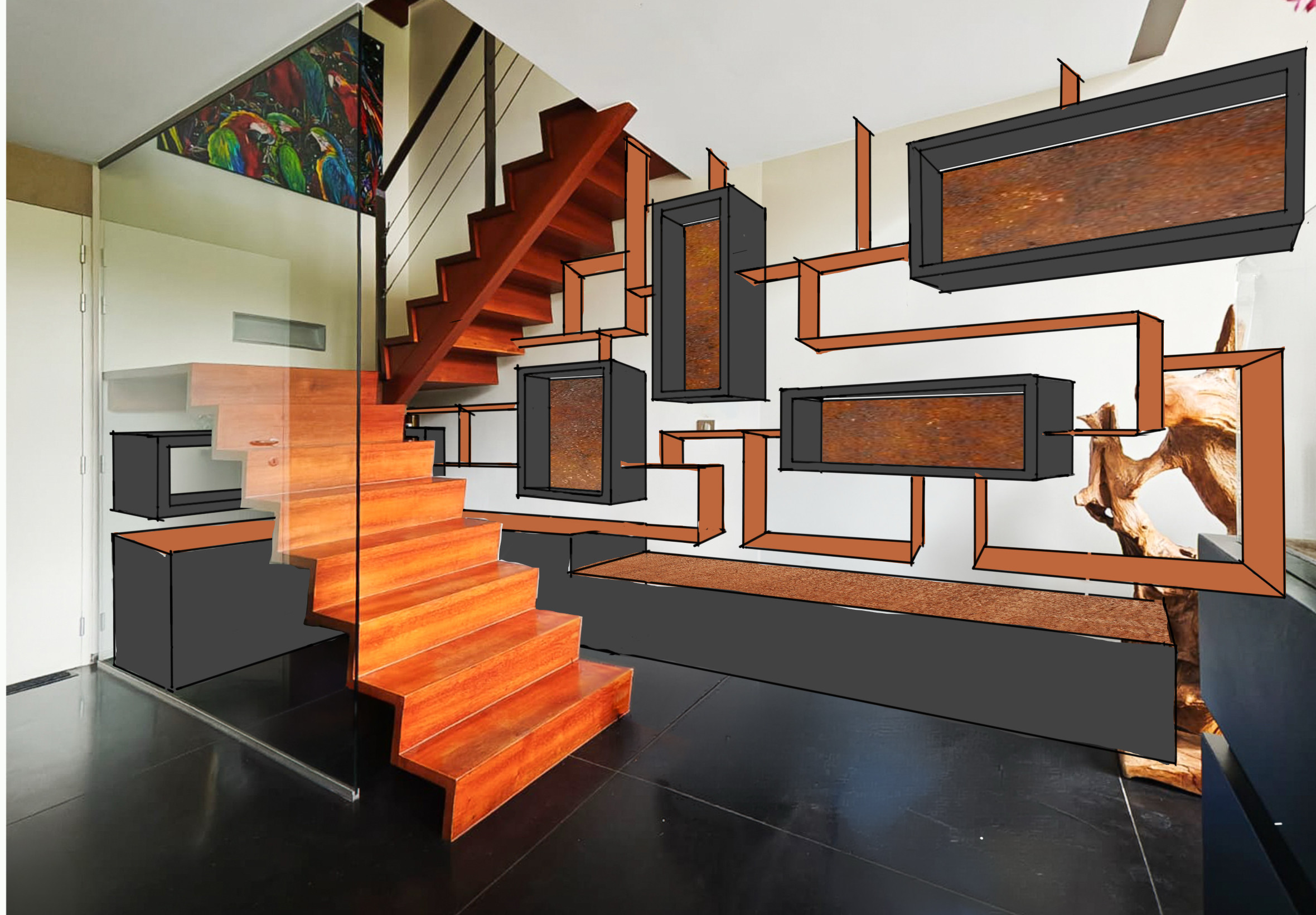 placage bois arapuntanga de bosq stratifi bois noir acier corten en fond de niches clairage indirect e1 n fon d des niches