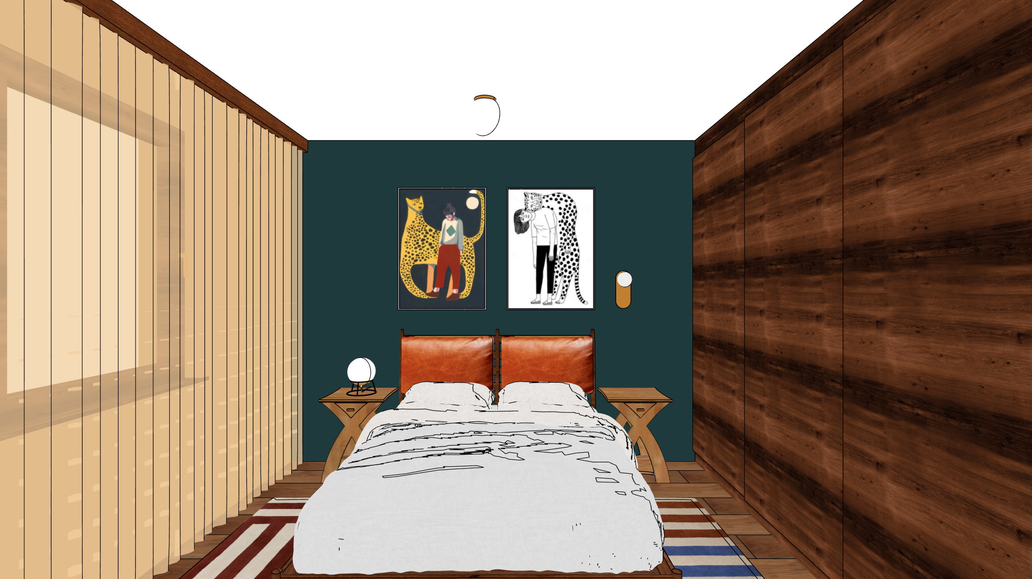 bedroom the opposite wall is dark teal colored there is a bed with wooden frame and leather cushions on the headboard there is artwork above the bed wooden bedside tables on the left bedside table there is a tablelight with a white frosted glass globe emmitting warm light on the right there is a wall scoce with a brass plate and a white frosted glass globe emmitting warm light on the ceiling is a ceiling light with a brass base and a white frosted glass globe emmitting warm light warm natural light is coming from the left hand side windows through the sheer curtains on the right there is a wooden built in wardrobe wooden plank floors with a soft bright colored area rug