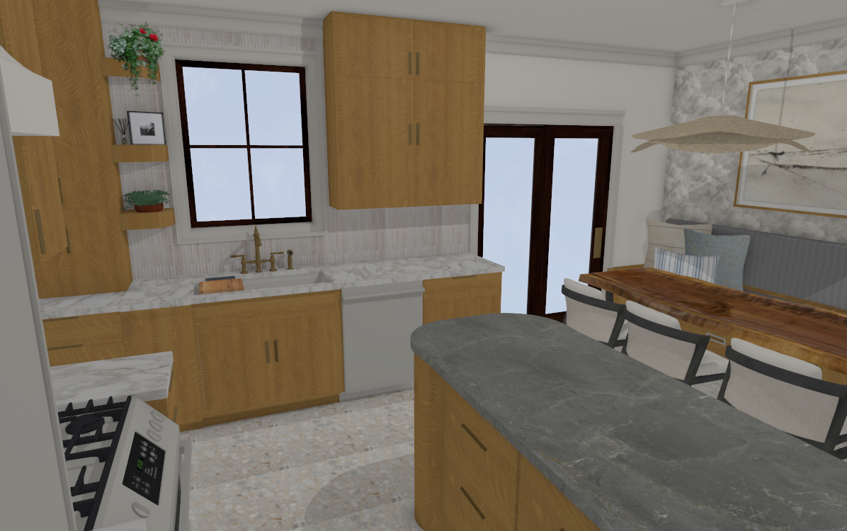 maintain the exact layout dimensions and placement of all elements do not change materials colors or geometry additionally apply a very subtle hand drawn architectural sketch overlay faint pencil line edges around furniture silhouettes cabinetry and key architectural elements as if barely sketched over the photograph keep it extremely subtle the photorealistic image must remain fully dominant