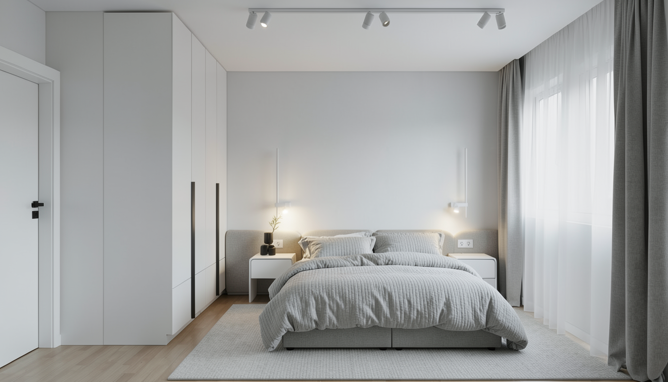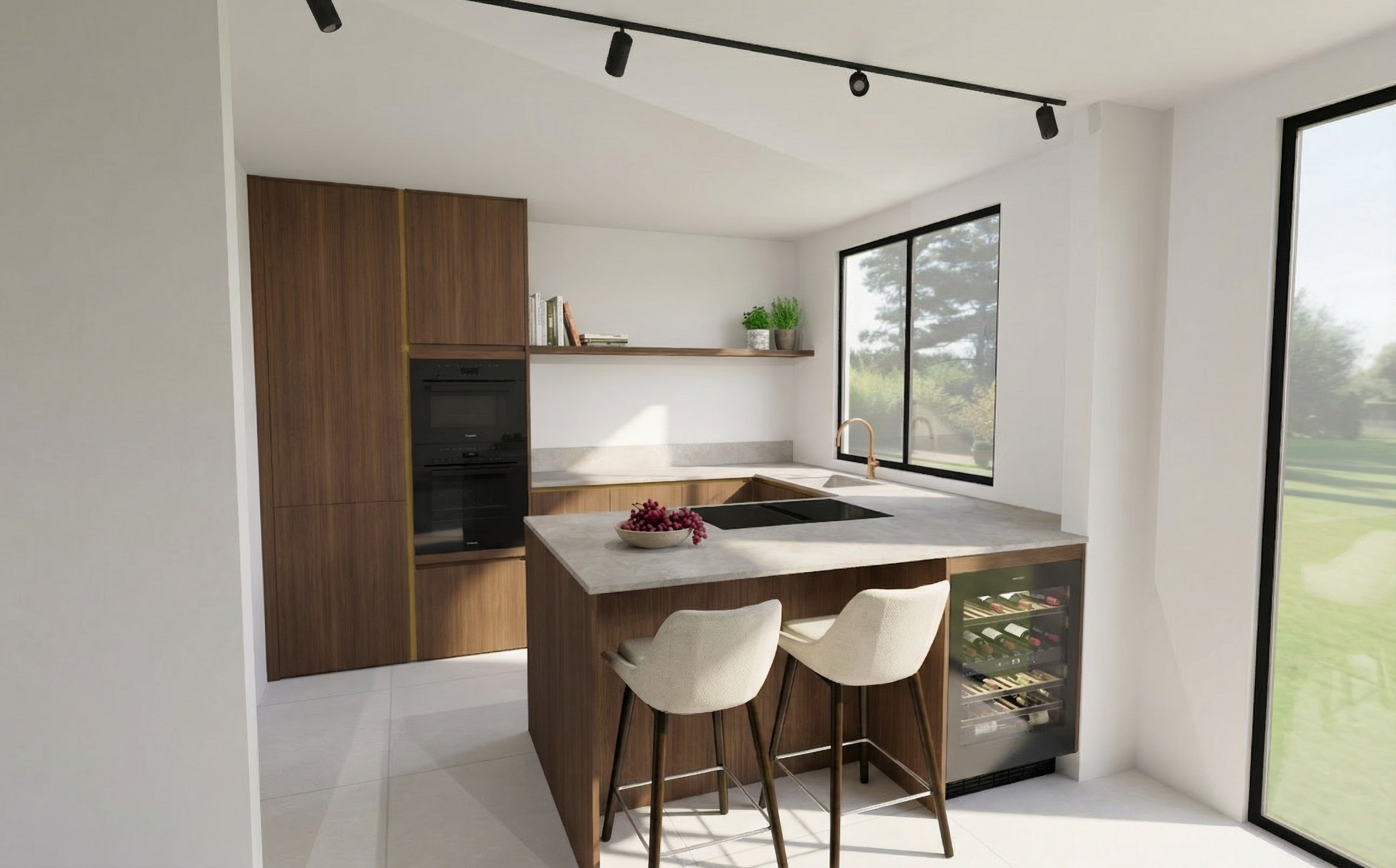 decorate this kichen lighting noon only add a few small elements and keep the direct sunlight subtle keep the collors as is add 1 small bowl of red grapes on the counter the yellow lines in the original image is gold