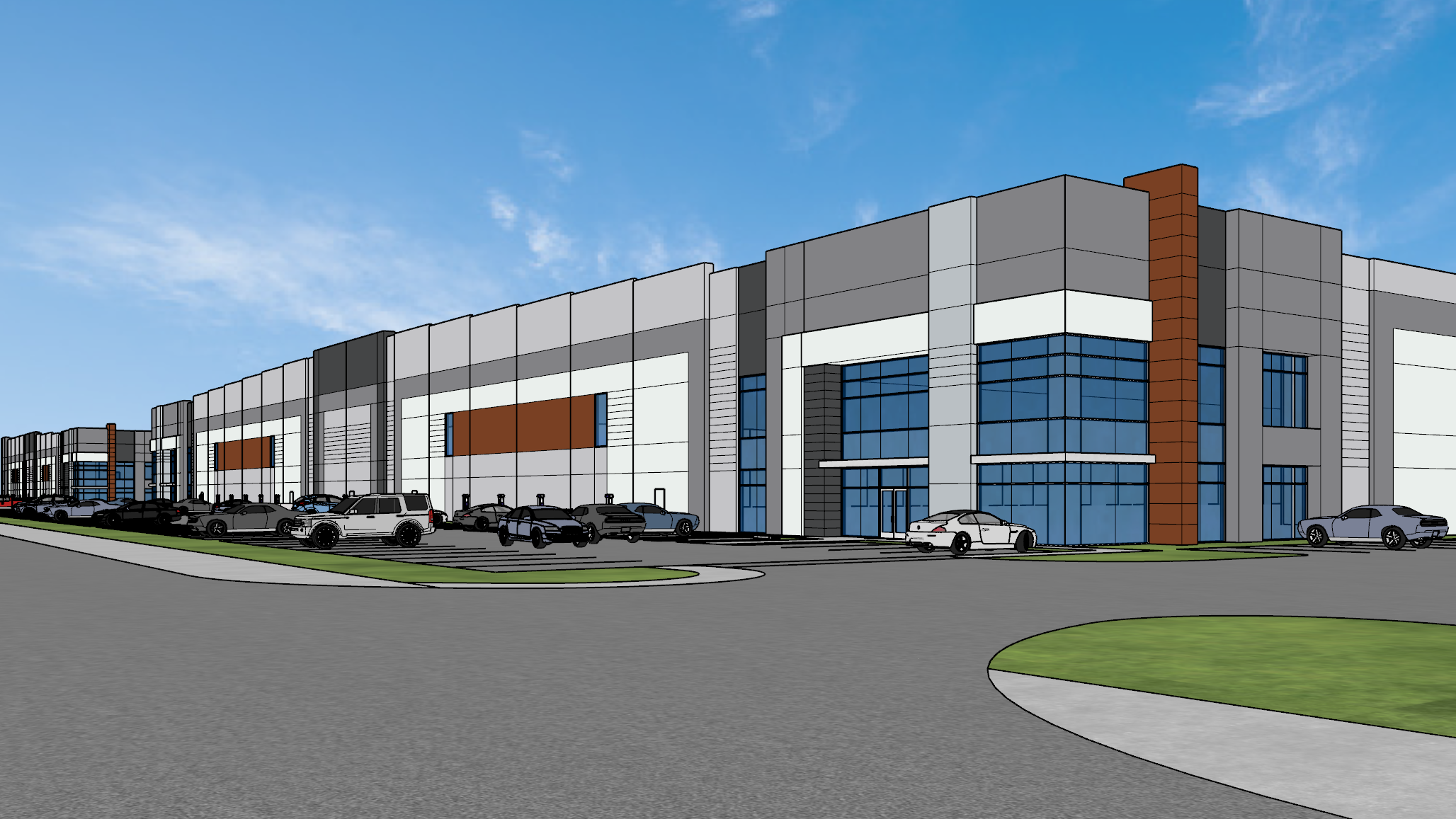 render a modern industrial complex with a sleek contemporary design use a palette of slate gray and light silver for the buildings with large reflective glass windows in a deep azure blue add green landscaped vegetation around the area with well kept grass and rich earthy brown tree trunks populate the parking lot with a variety of cars in metallic black white and silver gray the road should have a smooth asphalt texture in a muted gray the sky is clear and bright blue with wispy white clouds creating a calm and pleasant urban atmosphere