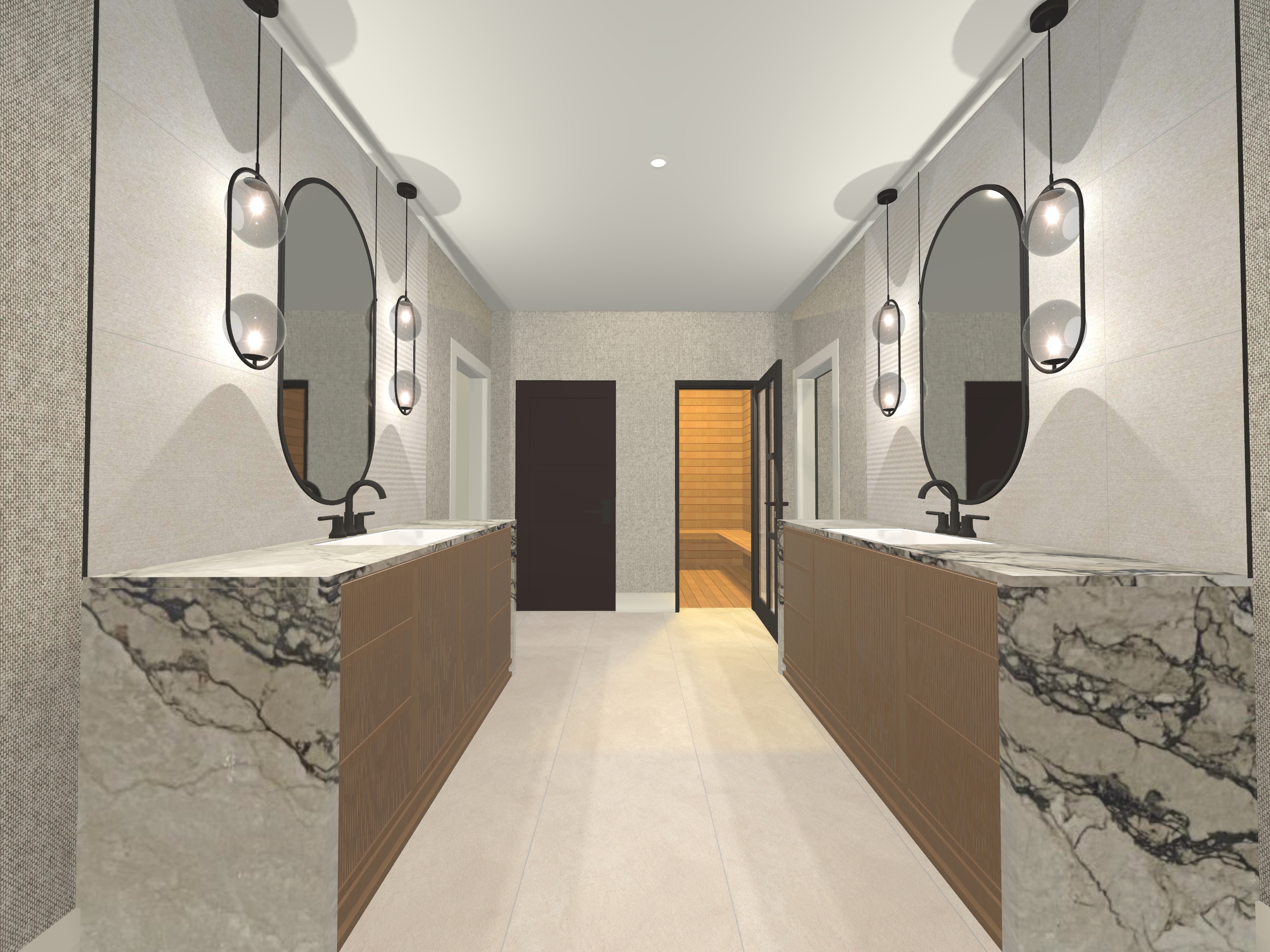 add a folded hand towel on the countertop of each vanity add a natural textured rug runner in between the two vanities add a small greenery on each vanity