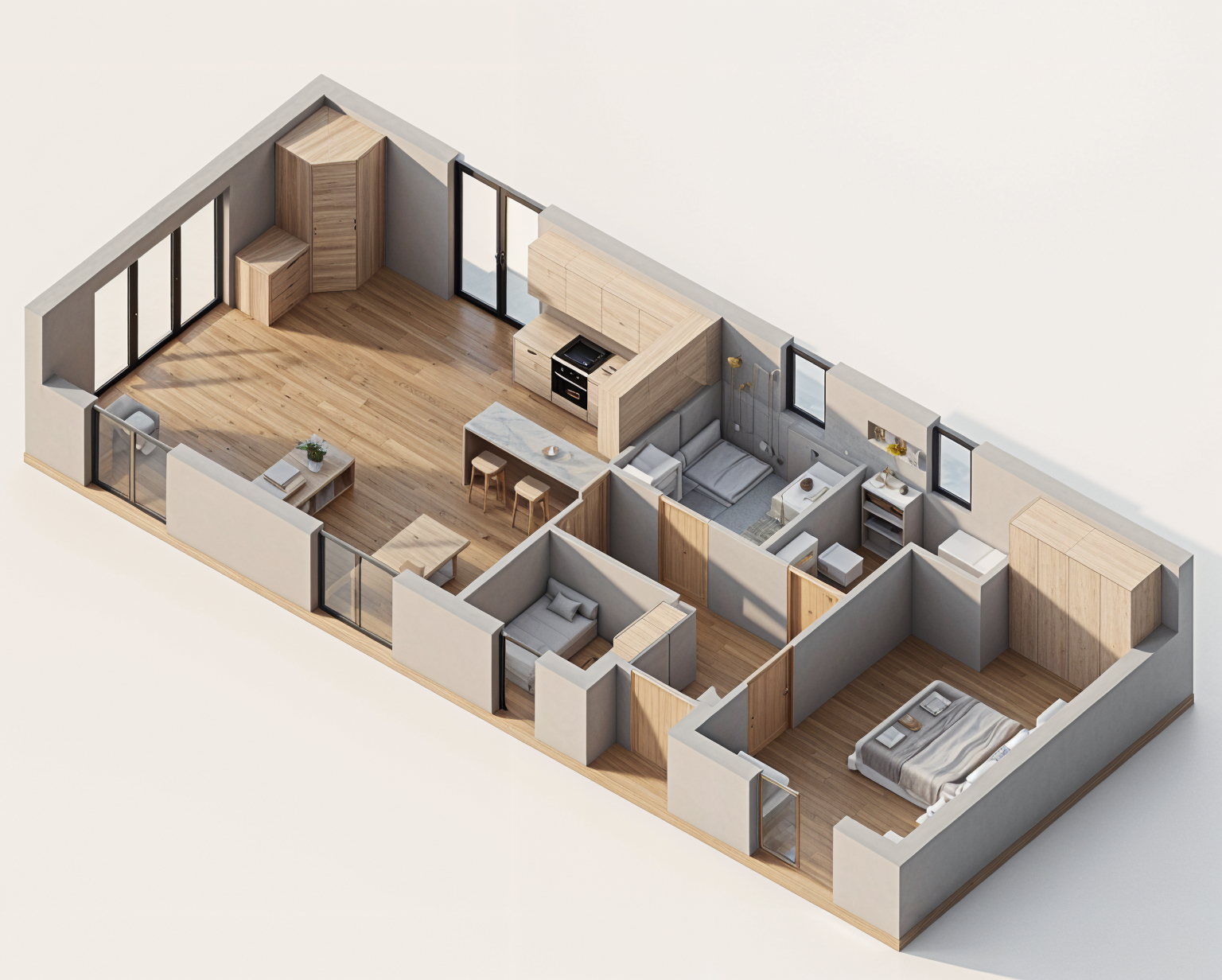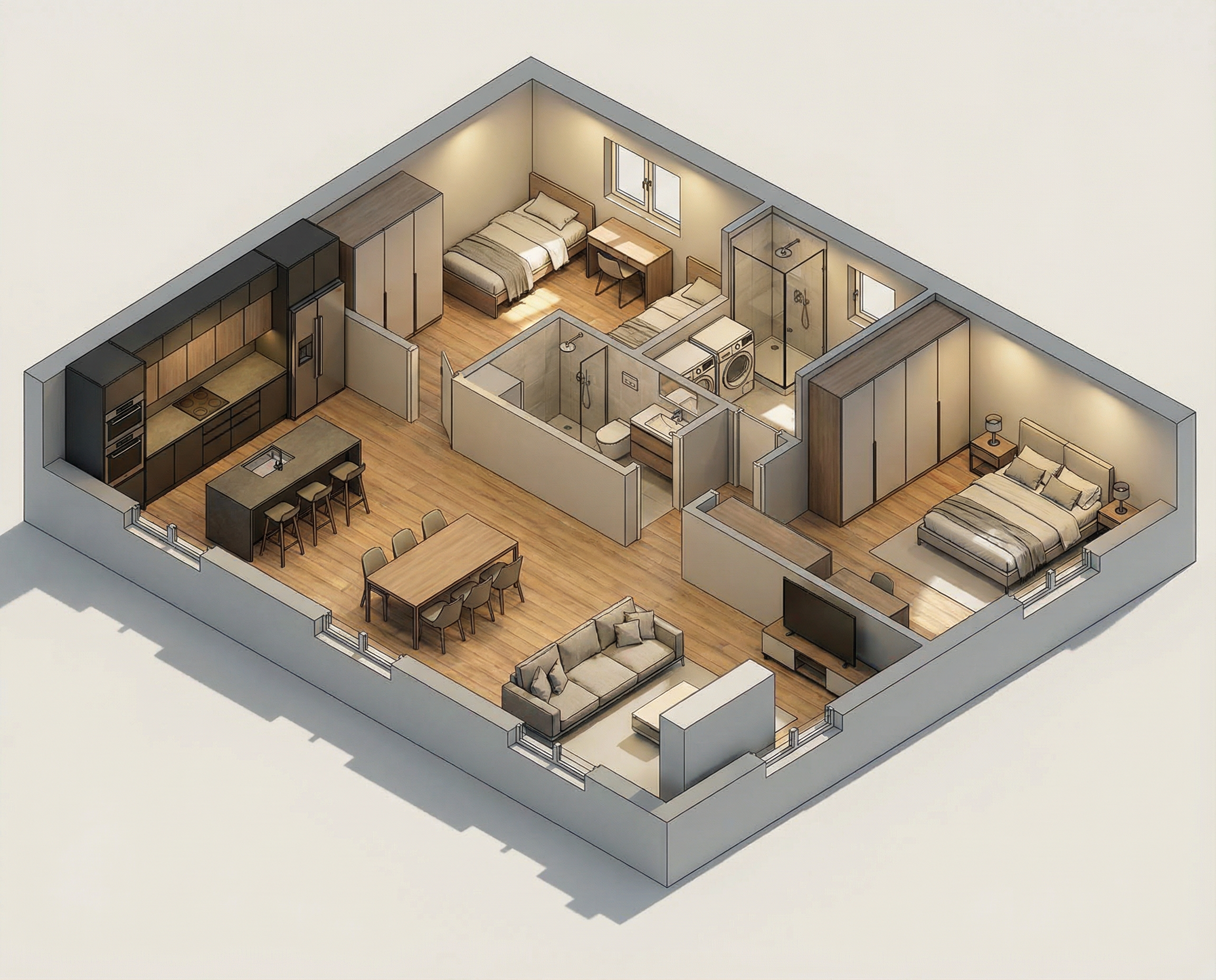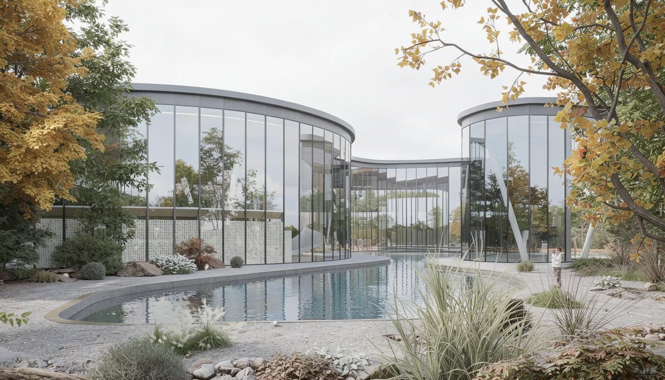important preserve the existing geometry and the existing context exactly as provided do not modify alter reinterpret add remove scale or reshape any geometry do not change the site surroundings street layout neighboring buildings vegetation or context elements do not modify geometry scale proportions buildings road layout sidewalks or surrounding context in any way bright overcast daylight atmosphere soft neutral natural light 5500 6500k evenly diffused sky illumination clean architectural daylight mood no dramatic sunset tones subtle soft shadows balanced exposure natural contrast large glass surfaces with realistic daylight reflections of sky and surroundings transparent but slightly reflective glazing no strong glare no harsh highlights light atmospheric depth with very subtle haze for realism dry pavement with soft light bounce and mild reflections physically accurate global illumination photorealistic architectural visualization calm contemporary mood crisp details neutral color grading high dynamic range professional architectural photography style
