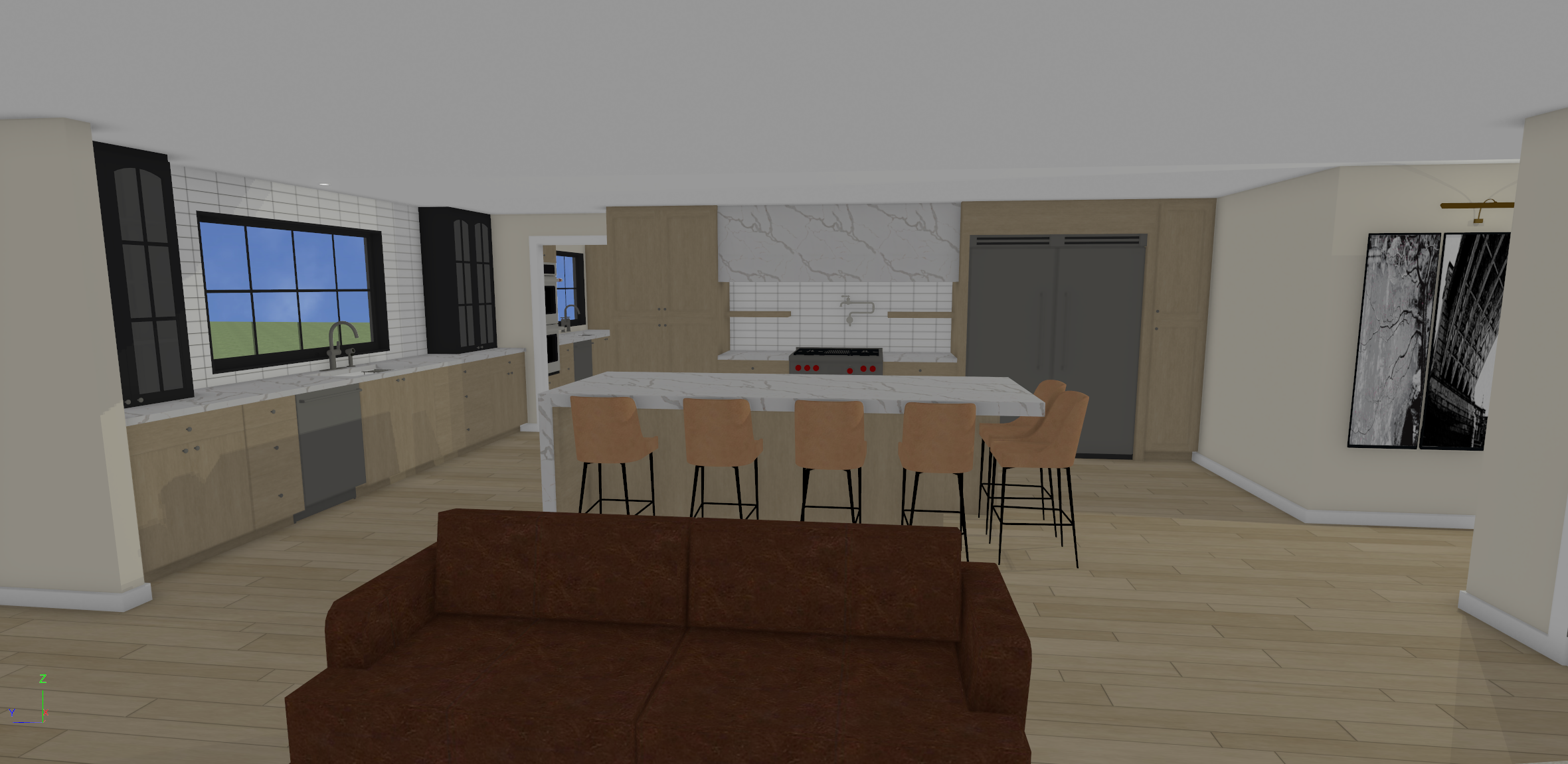 show this home in a photorealistic rendering keep the exact architectural details nighttime outside add recessed lighting in the ceiling bright interior