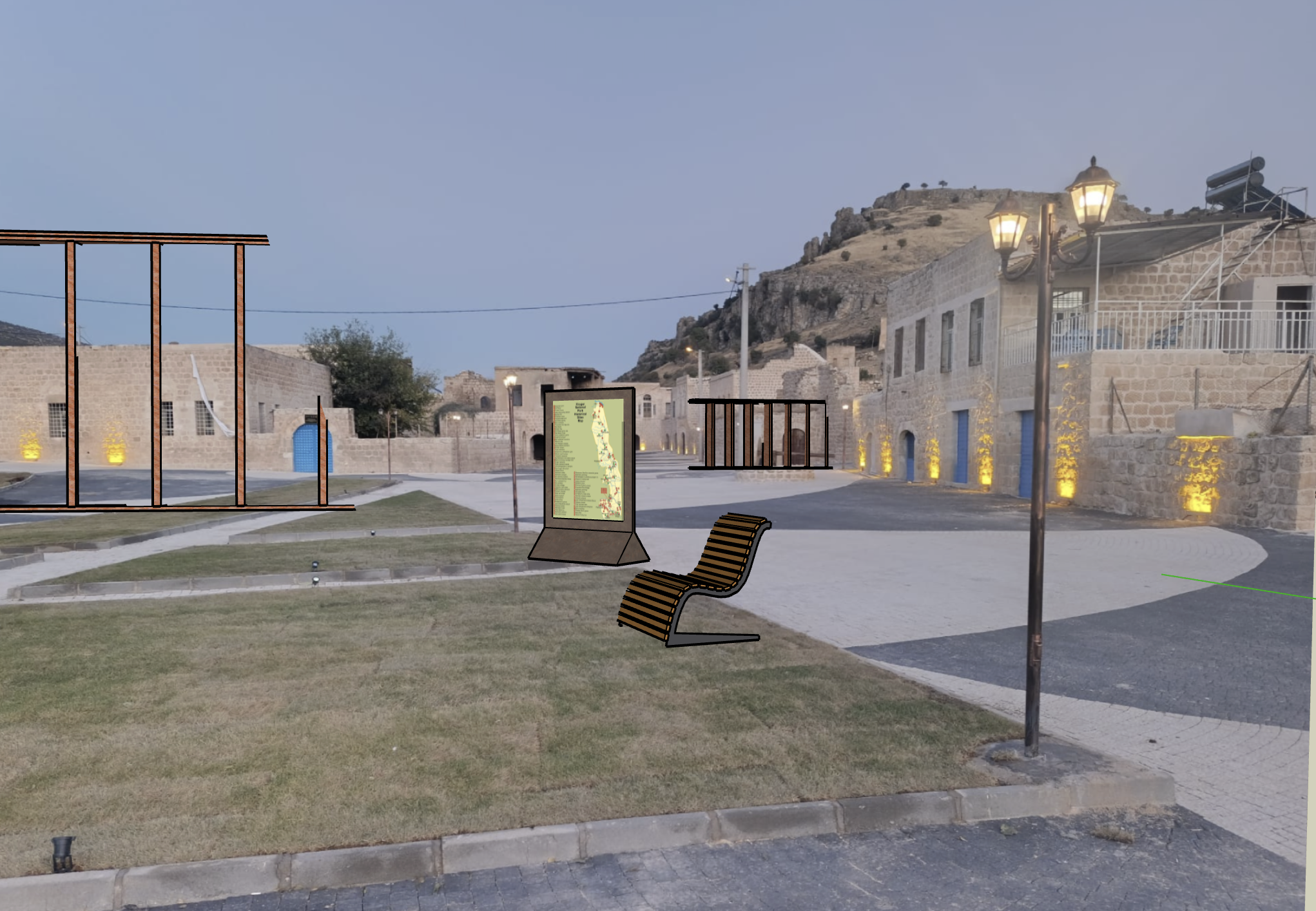 high tech exterior shot old ruin city with soft yellow led lamps on the ground making the buildings shine softly turistic info and benches on grass few corten steel bars next to building architecture