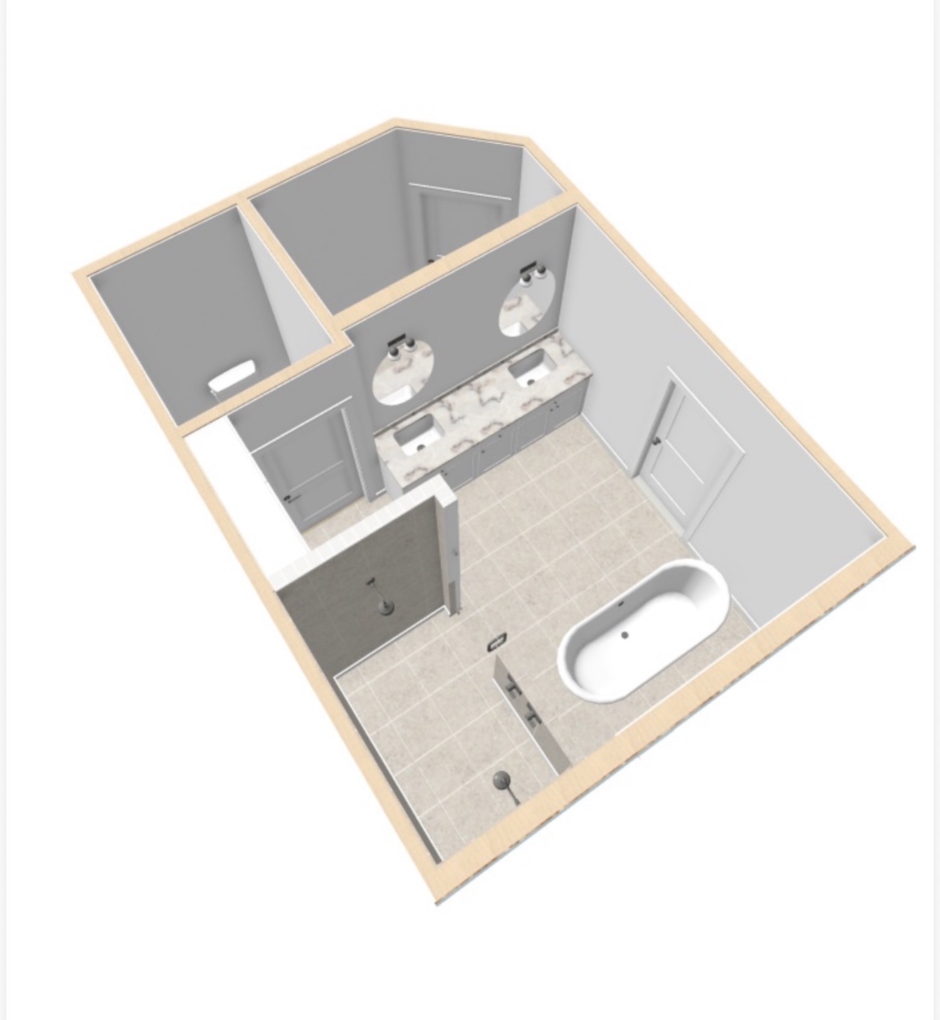 create a 3d render of this bathroom floor plan with organic coastal modern theme