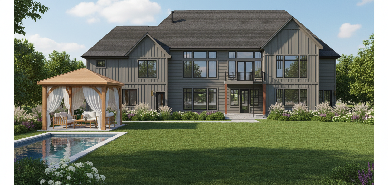 make the pool wider add more landscaping add table and chairs on deck make the siding soft black add dining table and chairs on the patio underneath the deck