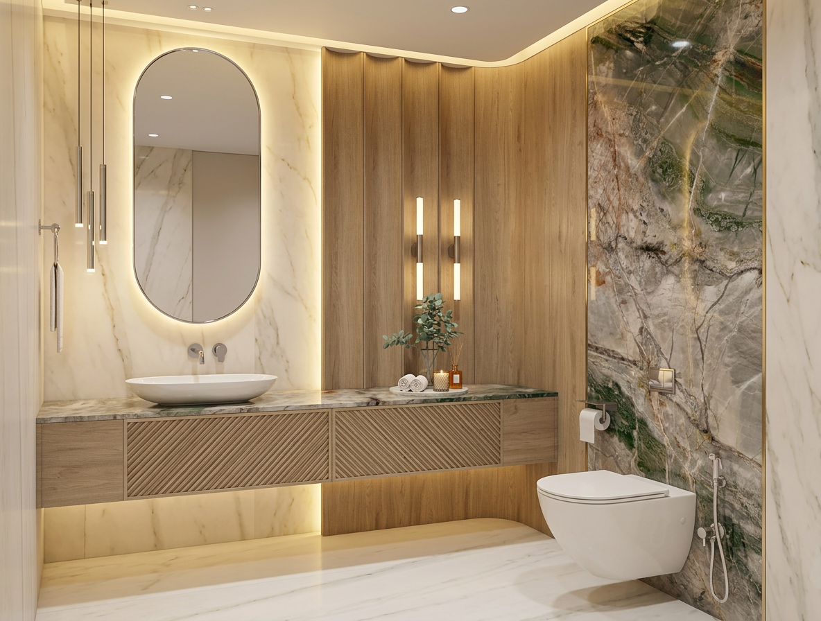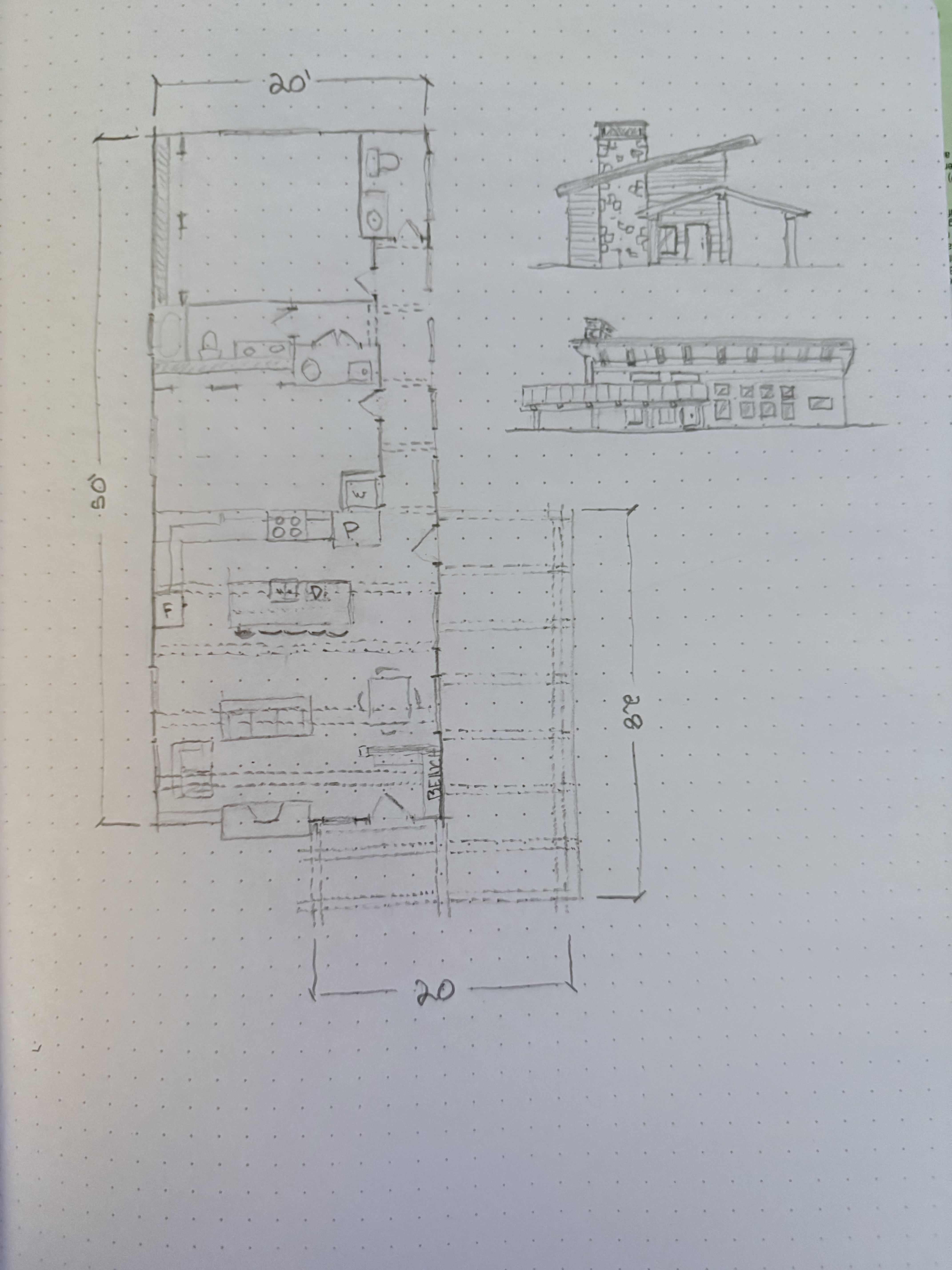 create a beautiful architectural rendering from the sketch of a modern house design use soft pastel tones for an elegant feel for the house exterior use a combination of light gray and cream with accents of natural wood textures the roof should feature a slate blue color windows are large with a reflective slightly tinted glass the chimney is clad in rustic stone with earth tones surround the house with green landscaping and a clear blue sky for a calm atmosphere add warm lighting glowing softly from the windows suggesting a cozy and inviting interior