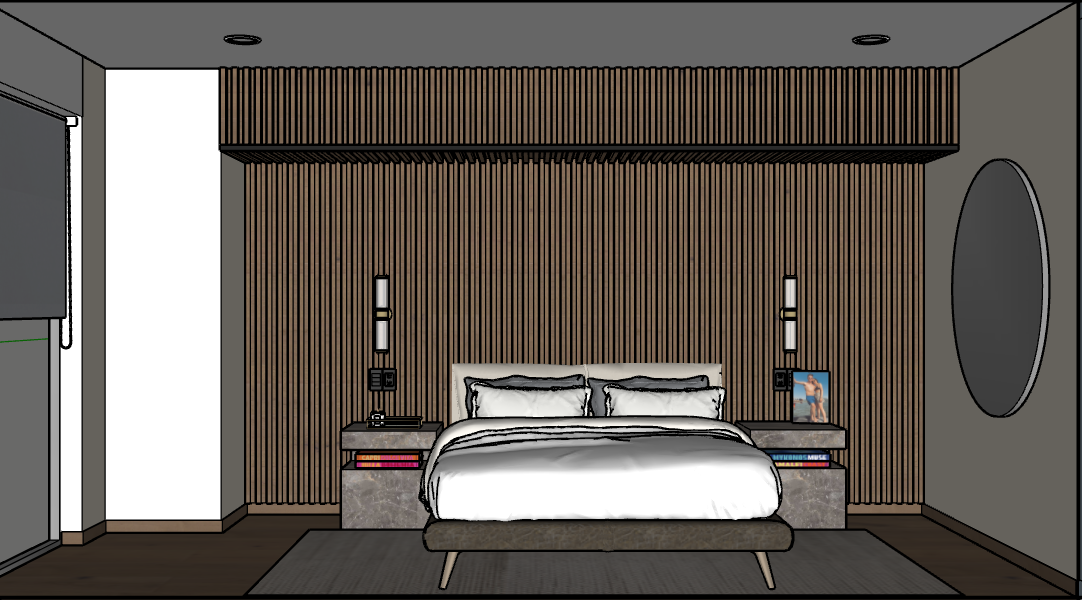 sunlight on the left window add natural and artifical lighting add light to the wall lamps trees bg on the window 2 spots of light on each side of the bedroom