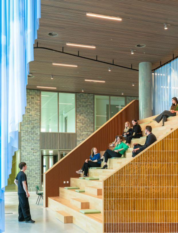 sustainable design interior shot render a modern indoor space with wooden bleacher seating a group of six people sitting and one person standing nearby the bleachers are made of a light wood with green accents the ceiling is wooden with recessed lighting creating a warm atmosphere to the left sheer blue curtains gently sway the background features a wall made of light gray bricks and large windows with green tinted glass the scene is bright airy and welcoming emphasizing a sense of collaboration and relaxation architecture