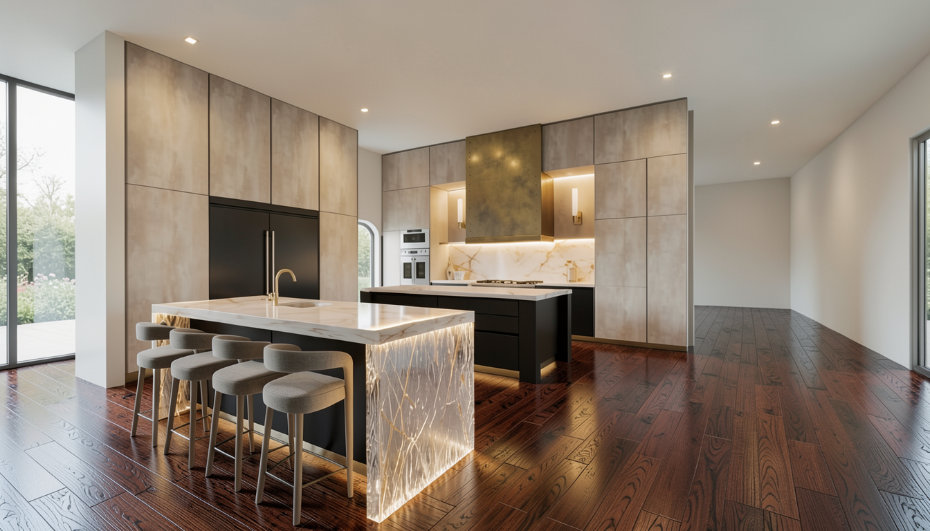 photorealistic modern luxury kitchen two center islands with matte black base cabinets perimeter cabinets unchanged antique brass range hood with cloudy patina rich yellow gold sheen soft specular highlights and micro scratches translucent crystal island countertops and backsplash with subtle warm led edge glow brushed brass fixtures soft natural daylight warm recessed downlights dark wood flooring realistic subsurface scattering and metallic reflections 35mm eye level slight wide angle f 4 filmic tonemapping high resolution pbr ray traced render