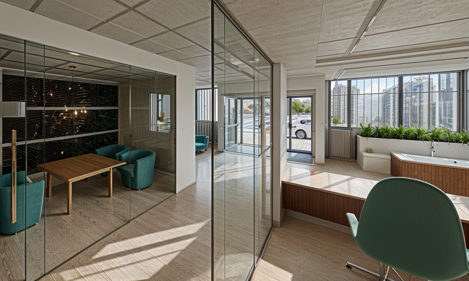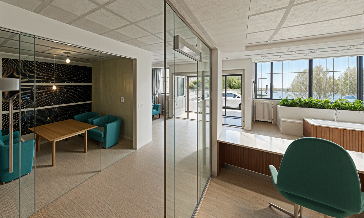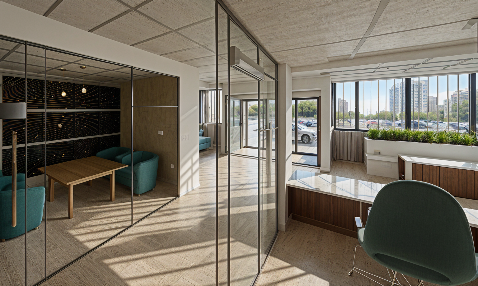 render a modern office interior use a soft warm lighting to create an inviting atmosphere for colors apply warm beige for the wooden floor soft white for the walls and deep teal for upholstered chairs highlight the desk with a rich dark wood tone ensure the ceiling has a light gray color to complement the modern aesthetic add subtle green plants near the window for a touch of nature and use a geometric patterned wall