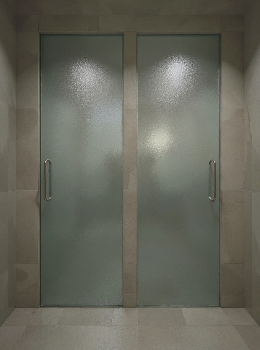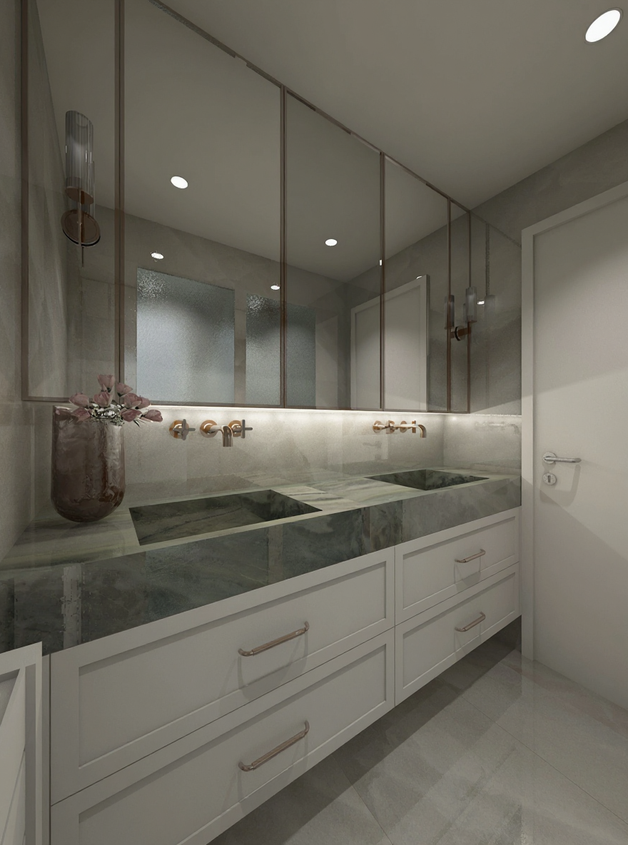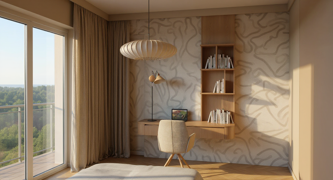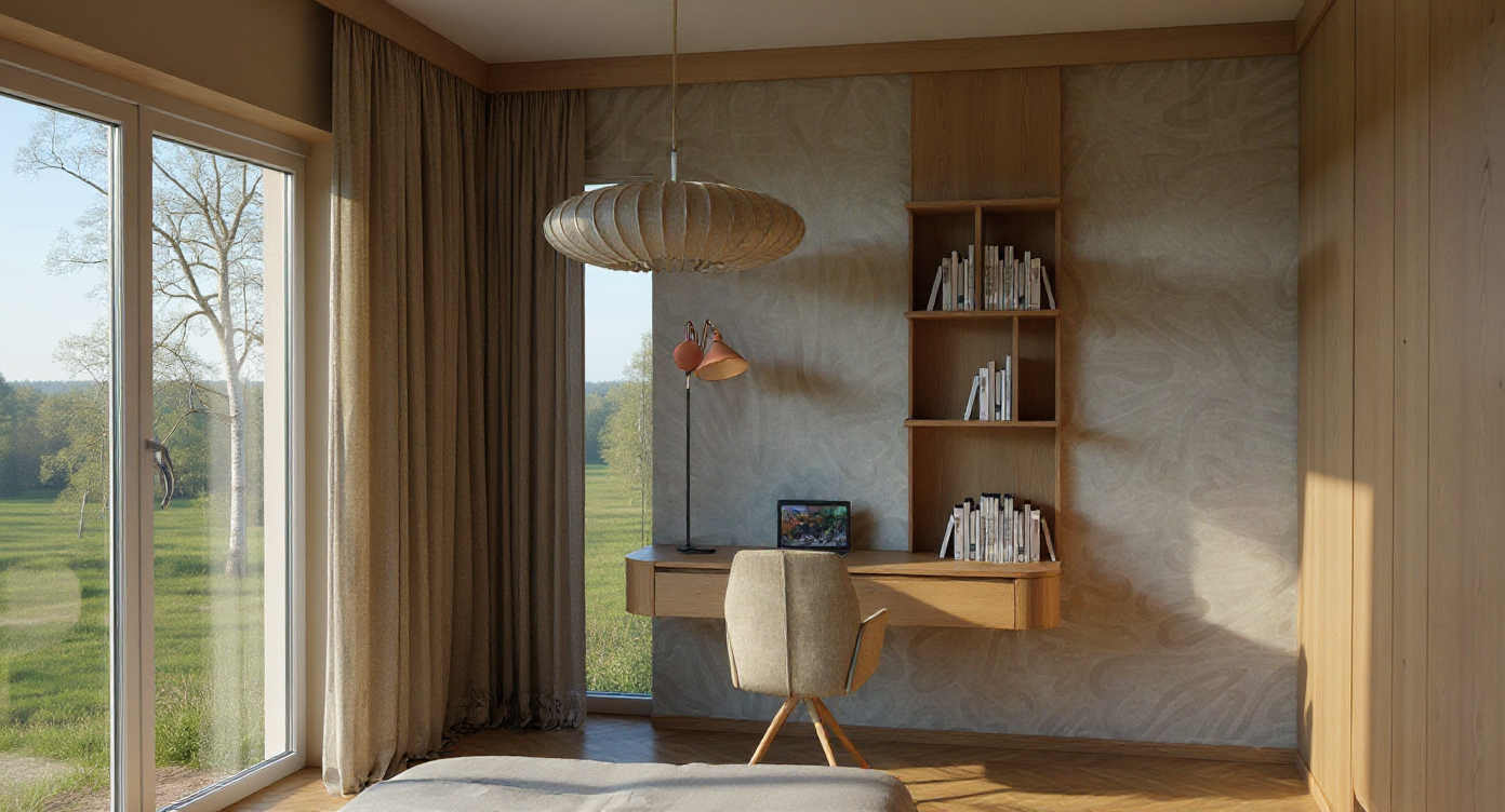 render a modern office interior use a soft warm lighting to create an inviting atmosphere for colors apply warm beige for the wooden floor soft white for the walls and deep teal for upholstered chairs highlight the desk with a rich dark wood tone ensure the ceiling has a light gray color to complement the modern aesthetic add subtle green plants near the window for a touch of nature and use a geometric patterned wall