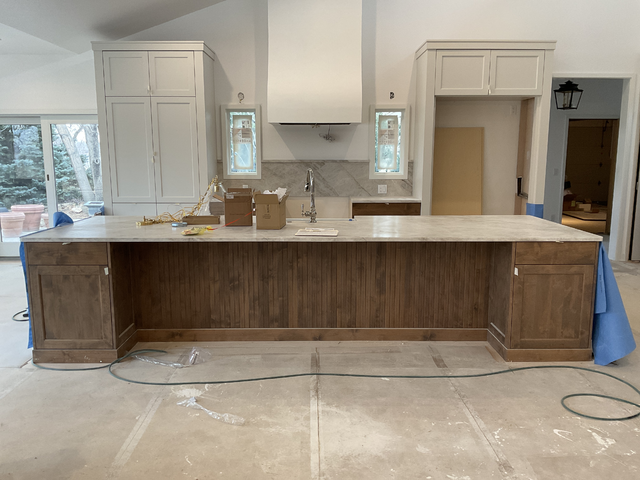 do not change the cabinets in any way preserve the exact cabinet colors materials finishes dimensions door and drawer styles hardware spacing alignment and all geometry exactly as shown do not alter the countertop shape backsplash appliances flooring lighting fixtures or wall structure only remove the construction materials clutter and mess from the scene clean the room and make it look finished and staged add a few simple tasteful home accessories appropriate for the style of the space but do not add or remove any furniture windows or architectural elements maintain the original lighting direction and realism enhance clarity and polish the photo while keeping the cabinetry and room design completely unchanged do not alter the lighting to keep the cabinet colors as they are in the image add a subzero built in fridge in the opening on the right add a slide in range below the hood add gold cabinet pulls to all of the door and drawer fronts add a simple view out the window add 4 simple stools to the island