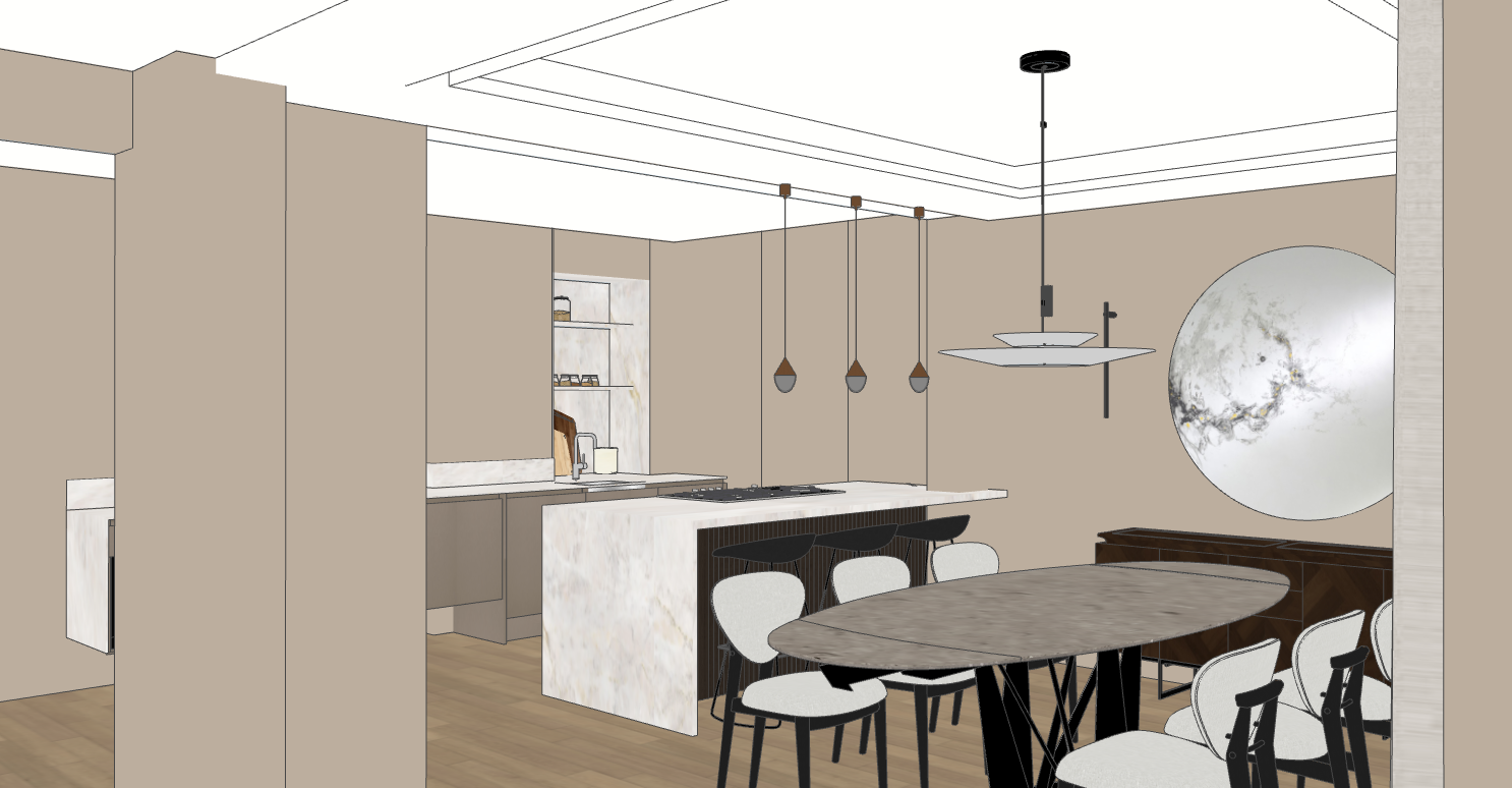 photorealistic architectural interior of a contemporary dining room and kitchen enhance materials lighting and realism only preserve all architecture furniture layout and lighting fixtures do not redesign or change geometry warm contemporary interior with smooth bone colored plaster walls and natural oak wood flooring kitchen with matte beige cabinetry and natural stone island with soft marble veining and realistic surface variation dining ceiling with recessed perimeter soffit ceiling cove detail including hidden warm led strip lighting for indirect illumination 2700k creating a soft ambient glow on the ceiling main suspended dining lamp is a vibia flamingo pendant lamp floating layered translucent diffuser minimalist contemporary design soft diffused light black structure with delicate suspension cables maintain original shape and proportions three pendant lamps above the kitchen island are il fanale dew pendant lights small glass drop shaped pendants with metal detail warm soft light elegant contemporary italian design preserve exact number and positions round wall mirror is roche bobois style designer mirror large circular mirror with subtle artistic texture and soft reflective properties maintain size and placement realistic natural daylight mixed with warm artificial lighting soft global illumination realistic reflections subtle ambient occlusion natural shadow gradients interior architectural photography style realistic pbr materials subtle imperfections tactile surfaces natural color grading soft depth of field high dynamic range ultra photorealistic architectural visualization image enhancement only no redesign no furniture changes no lighting fixture replacement preserve existing architectural details