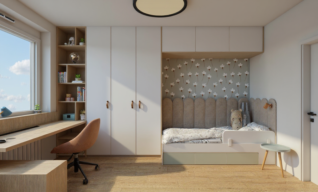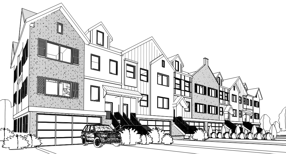 exterior shot light gray stone for the base and main corner extending all the way up white composite panels with black accents trim canopies bands window frames shutters for the rest solid black garage doors a lively ambiance with people walking and warm interior lighting from within