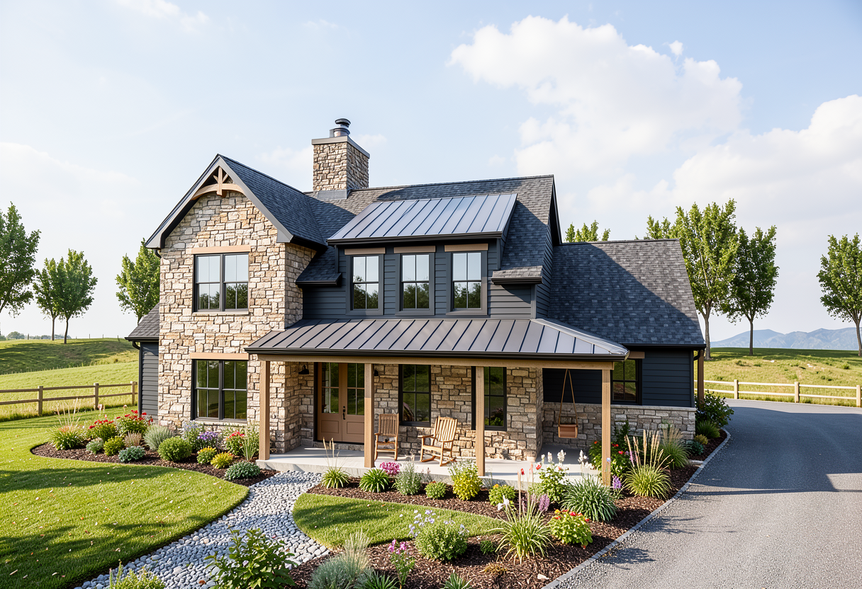 farmhouse cottage in a rural setting maintain house colors and textures clean crisp white siding with full mountain stone improve the landscaping just around the house driveway on the right side