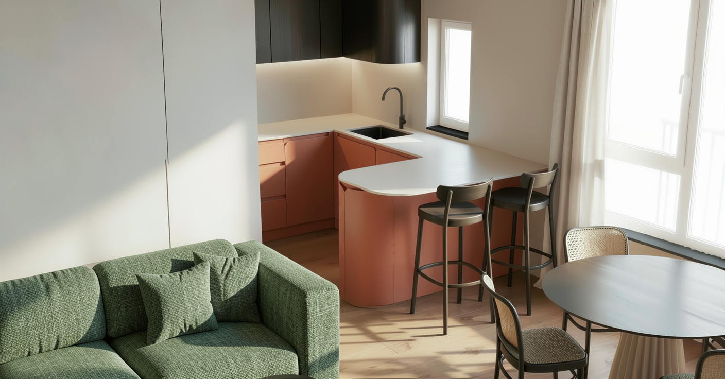 add white hydrangea flowers on the island moody light sunny light from the windows do not change cabinets nor add open shelves don t add new cabinets