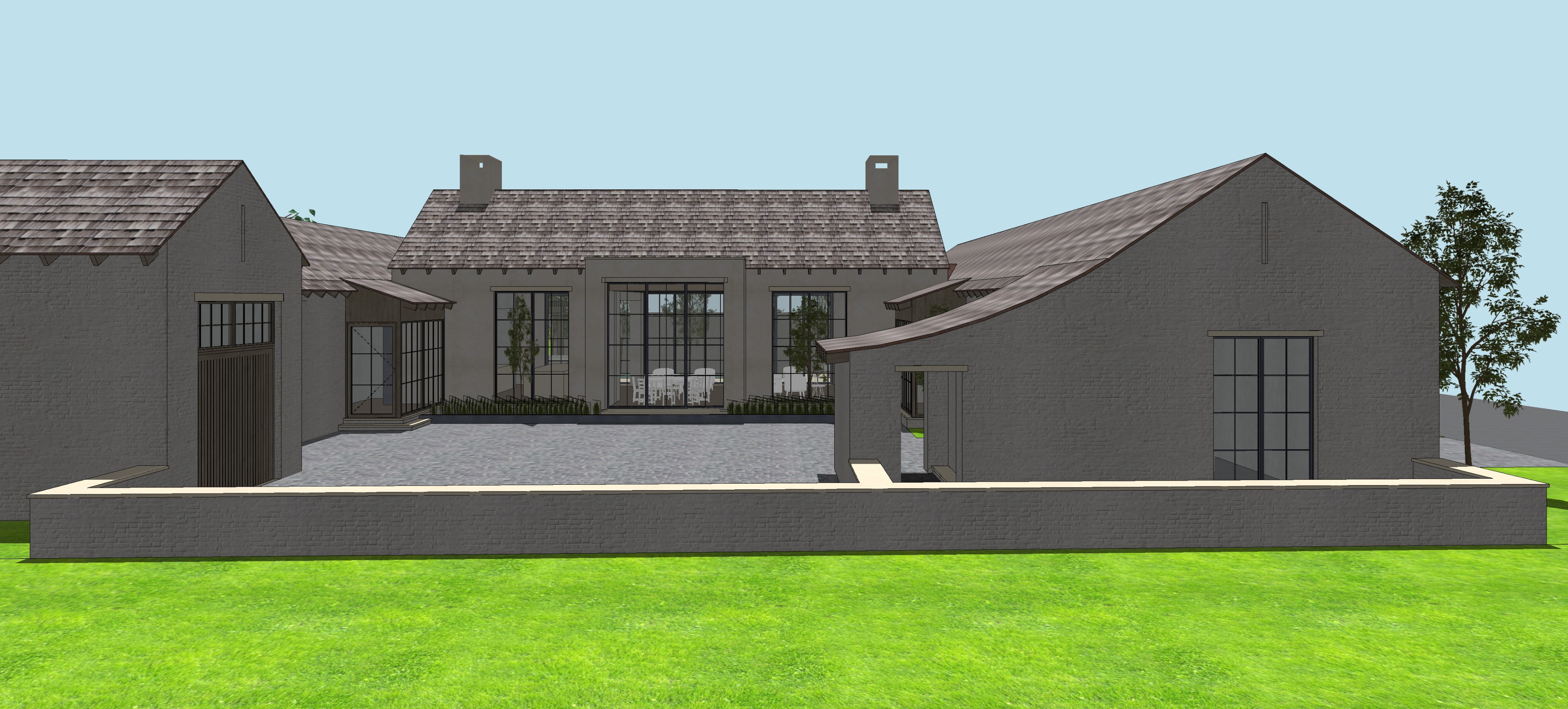 cedar shake roof off white plaster off white limewashed antique brick cobble stone warm lighting